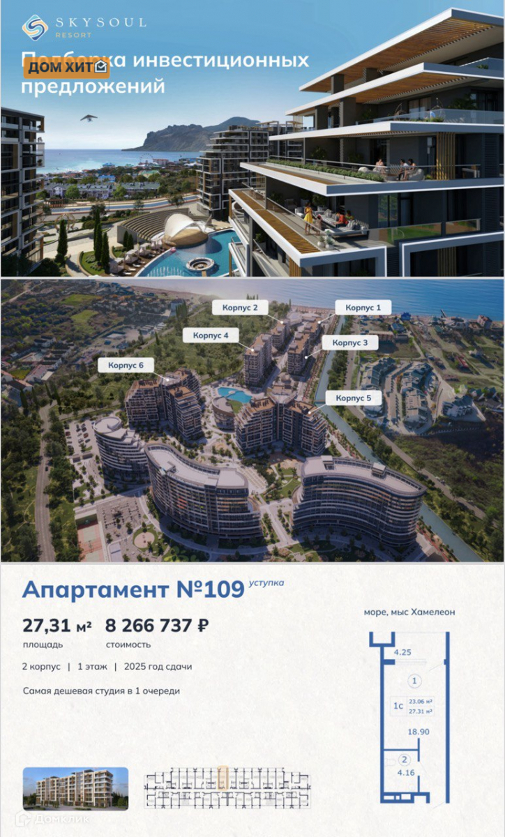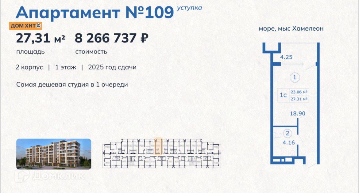 1-комнатная квартира, 27.31 м2, этаж 1 / 6, на продажу в поселке городского типа Коктебель, Арматлукская улица, 2