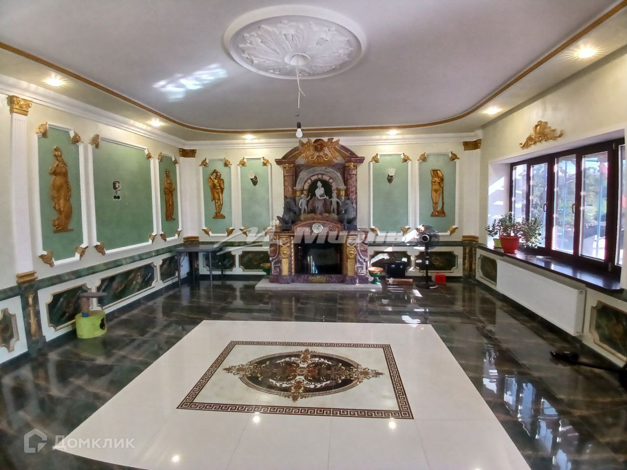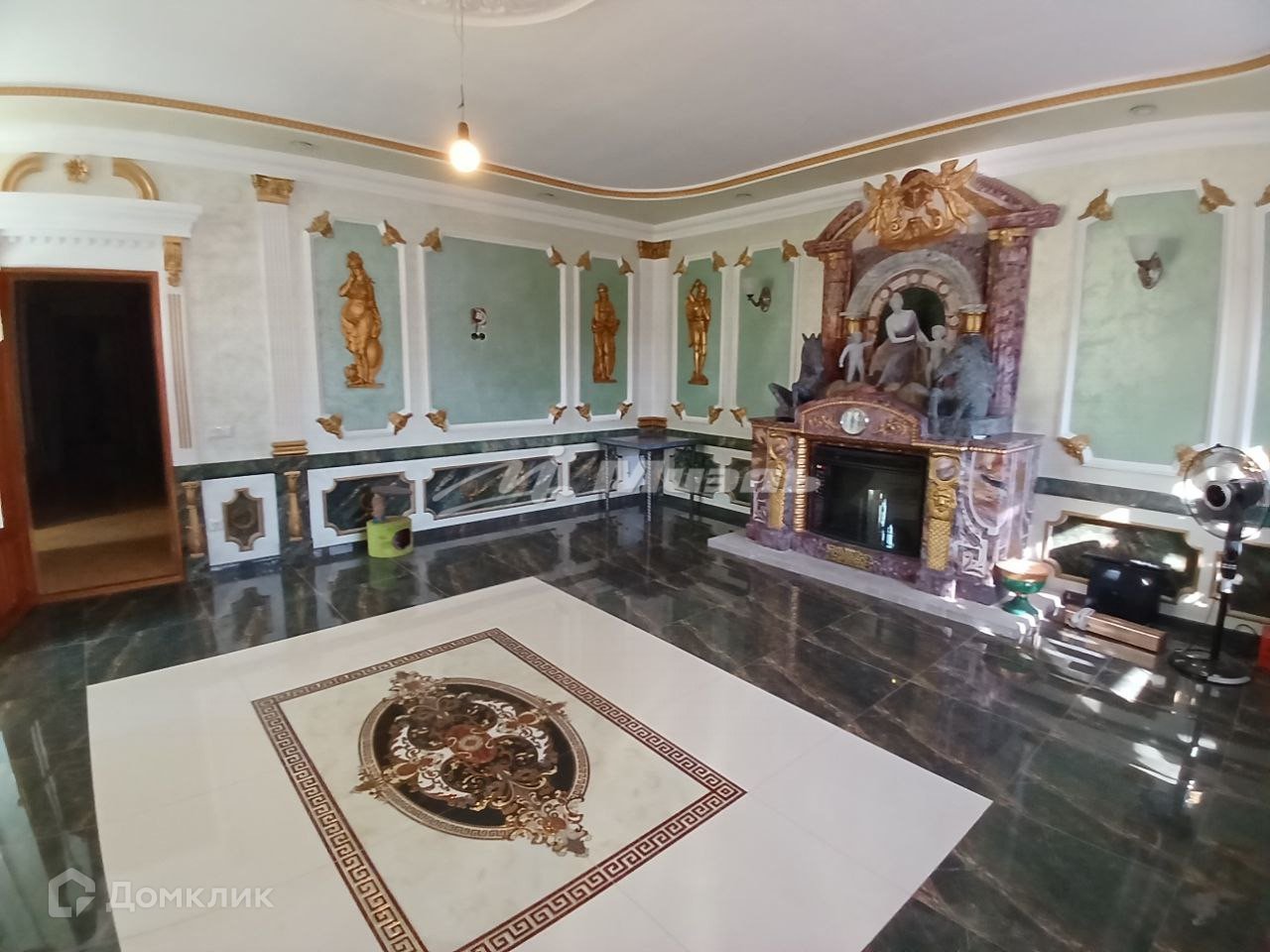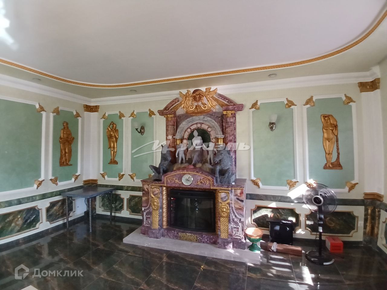 просторный каминный зал, ванная комната, баня и просторная кухня-гостиная.