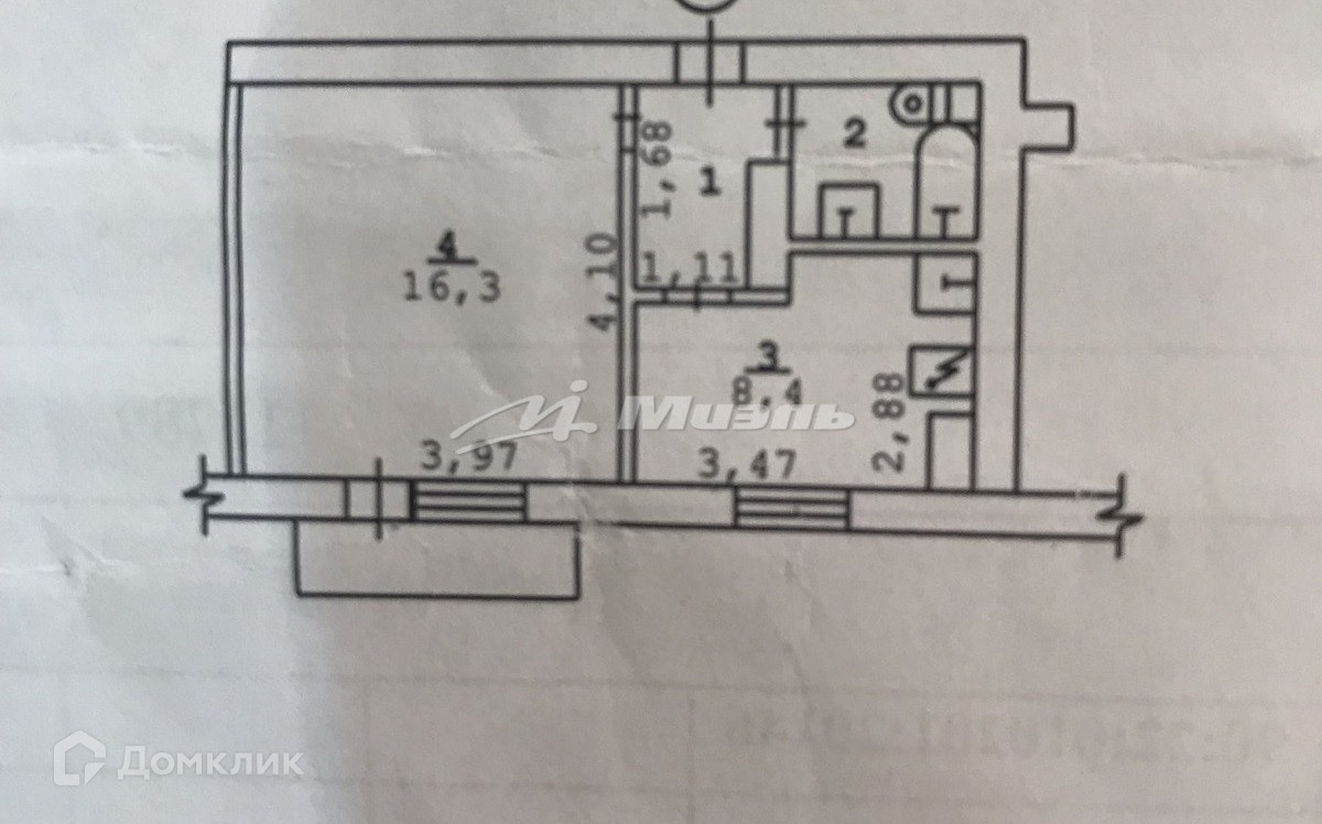 Общая площадь 30,4 кв. м., жилая 16,3 кв. м., кухня 8,4 кв. м.