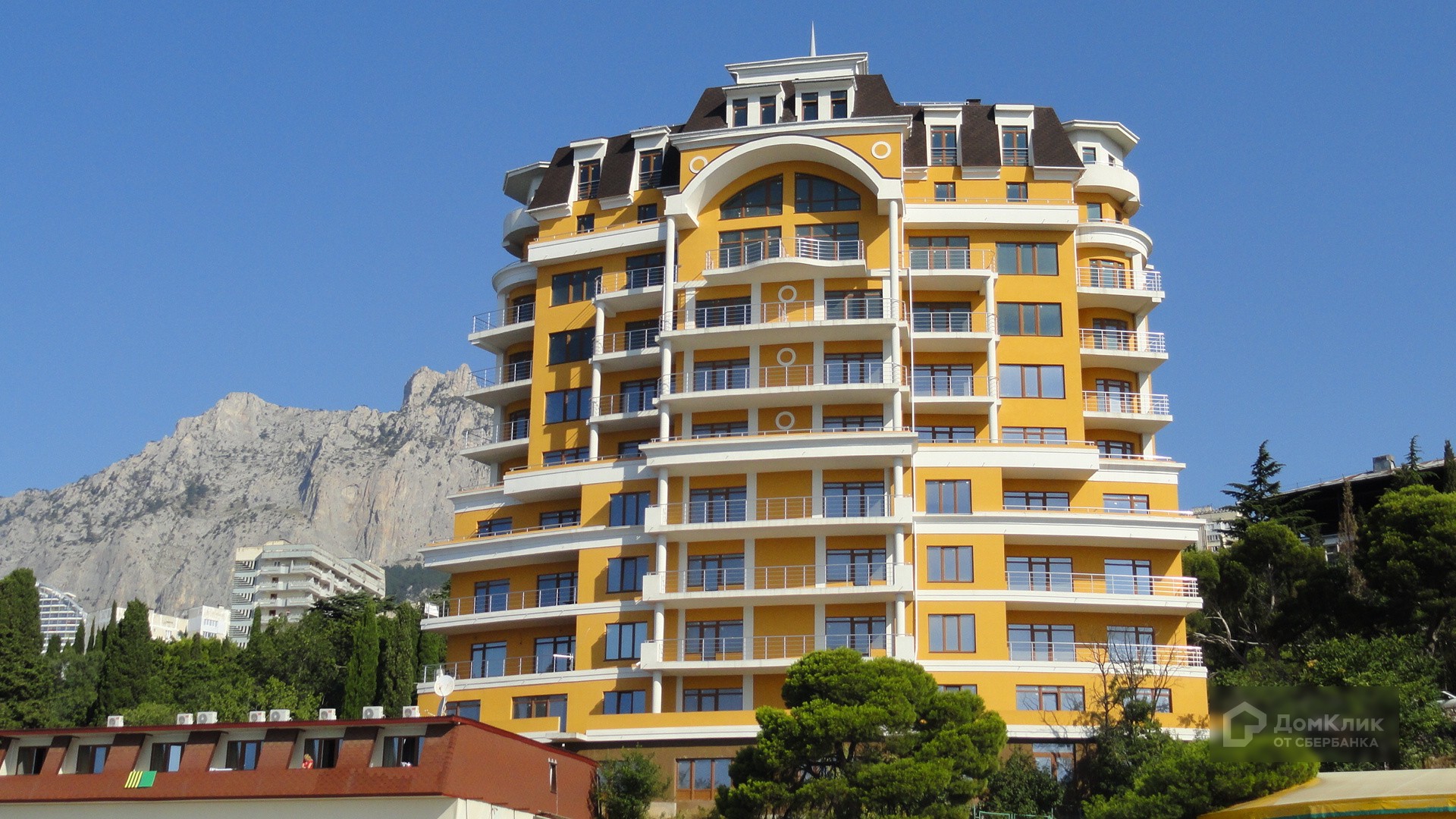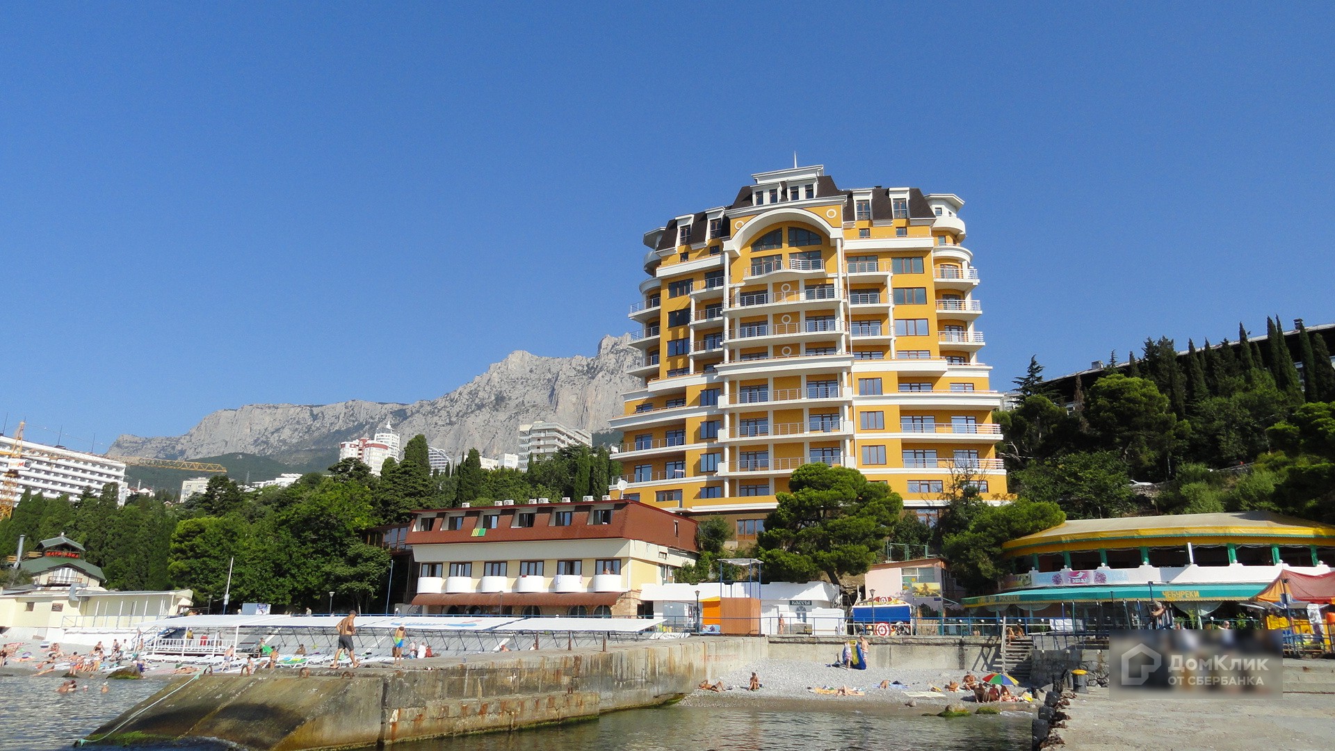 Здание расположено в 50 метрах от береговой линии Черного моря. Из окон открывается шикарный панорамный вид на Черное море и Крымские горы, Ай-Петри.