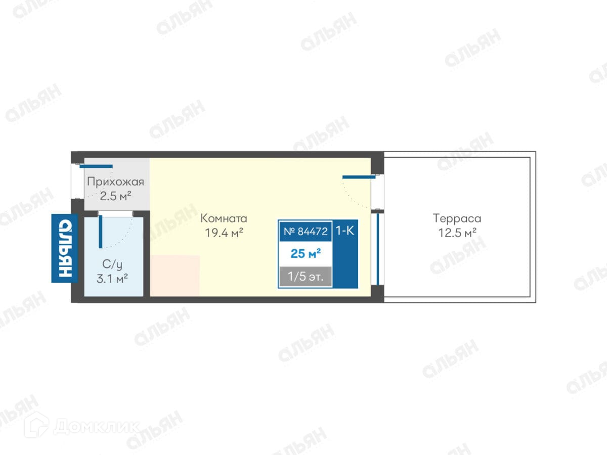 Комната 19,4 м2, санузел 3,1 м2, коридор 2,5 м2, терраса 12,5 м2.