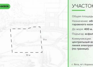 Объект № 44906 Мы находим уникальные варианты и совершаем сделки быстрее других. В продаже земельный участок в городе Ялта, поселок городского типа Кореиз, шоссе Алупкинское. Площадь участка — 0,7 соток. Назначение – хранение автотранспорта. Отличное вложение в недвижимость. — Локация: расстояние до школы, детского сада, аптек, центра города 60... |