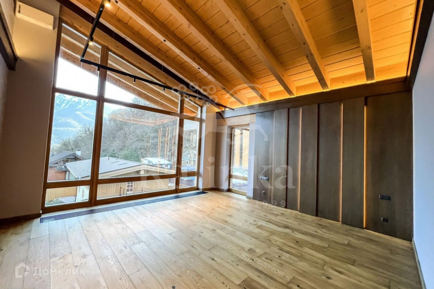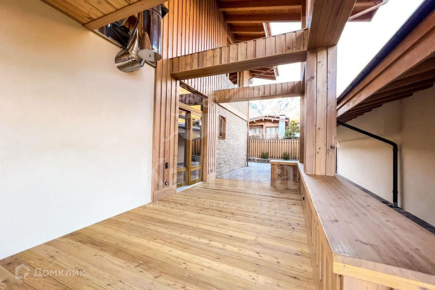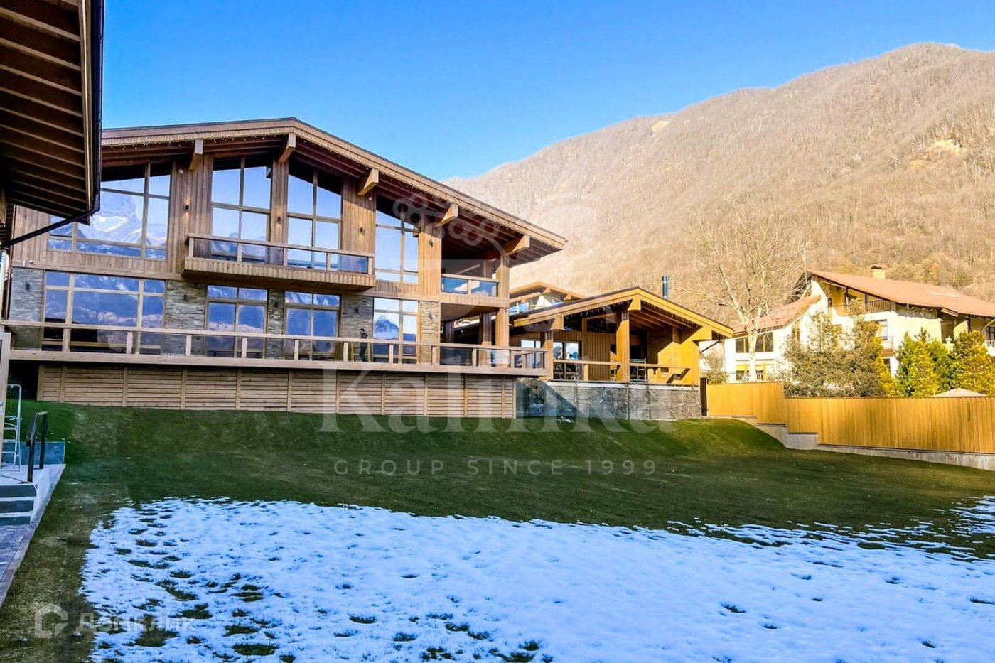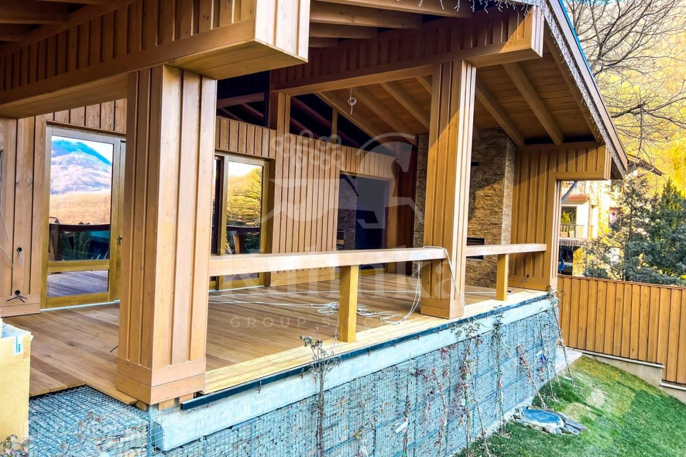 При строительстве дома использовались только натуральные материалы, в основном дерево и камень. Шале-дом полностью обустроен и оформлен в стиле дизайнерской отделки. Мебель в доме была изготовлена на заказ, что подчеркивает уникальность и неповторимость этого проекта. Планировка дома очень комфортная и просторная. В каждой спальне есть собственный санузел и гардеробная. Из всех комнат открывается прекрасный вид на горы.
