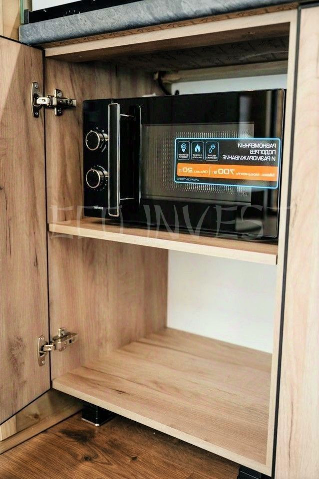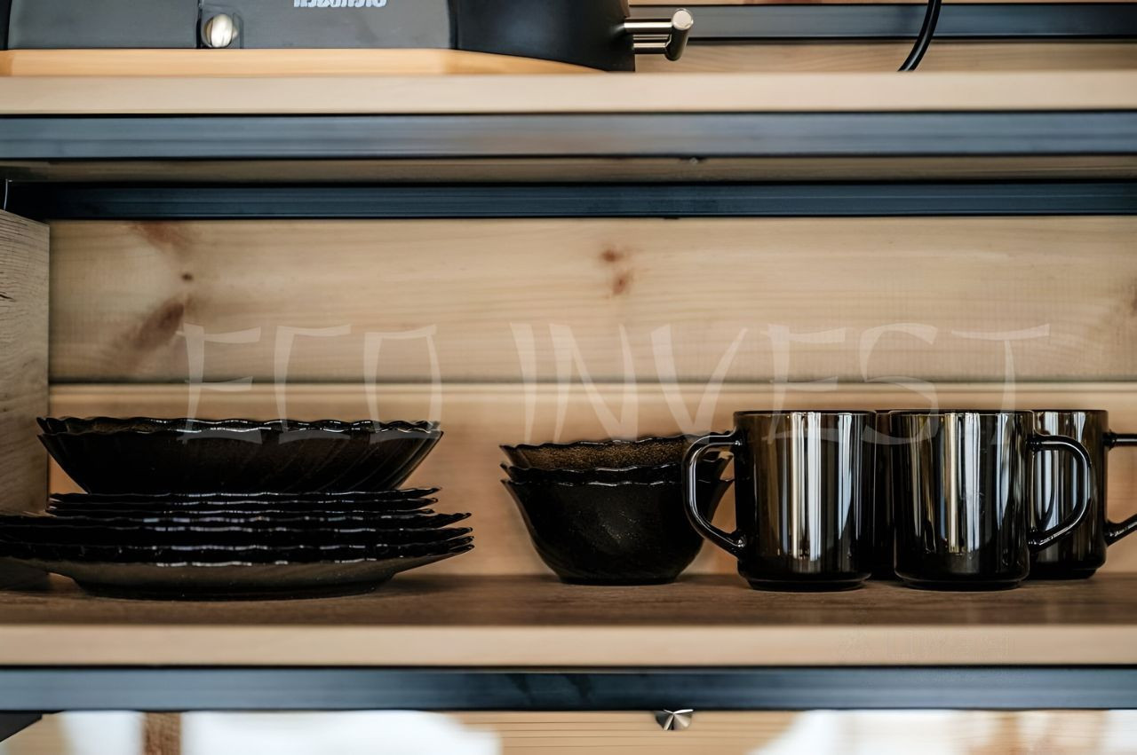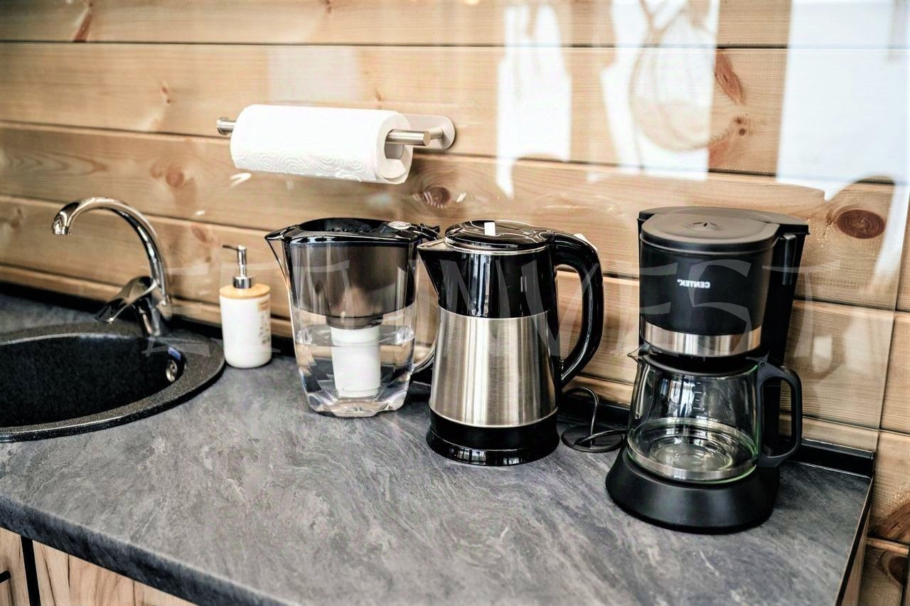 Кухня: холодильник, варочная панель, микроволновая печь, электрический чайник, капельная кофеварка; посуда, столовые приборы, чай, кофе, сахар, сахарозаменитель, соль, перец;
