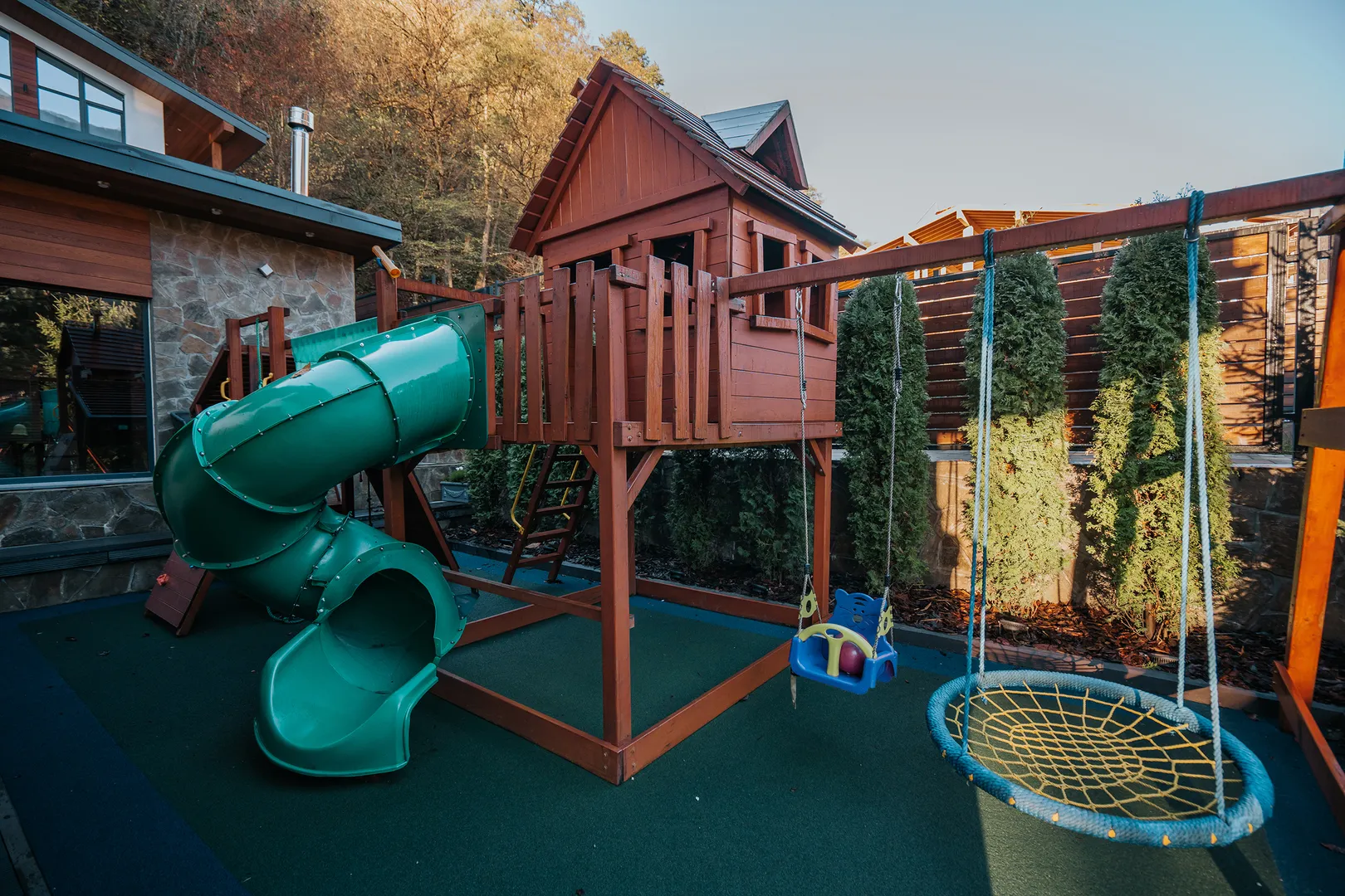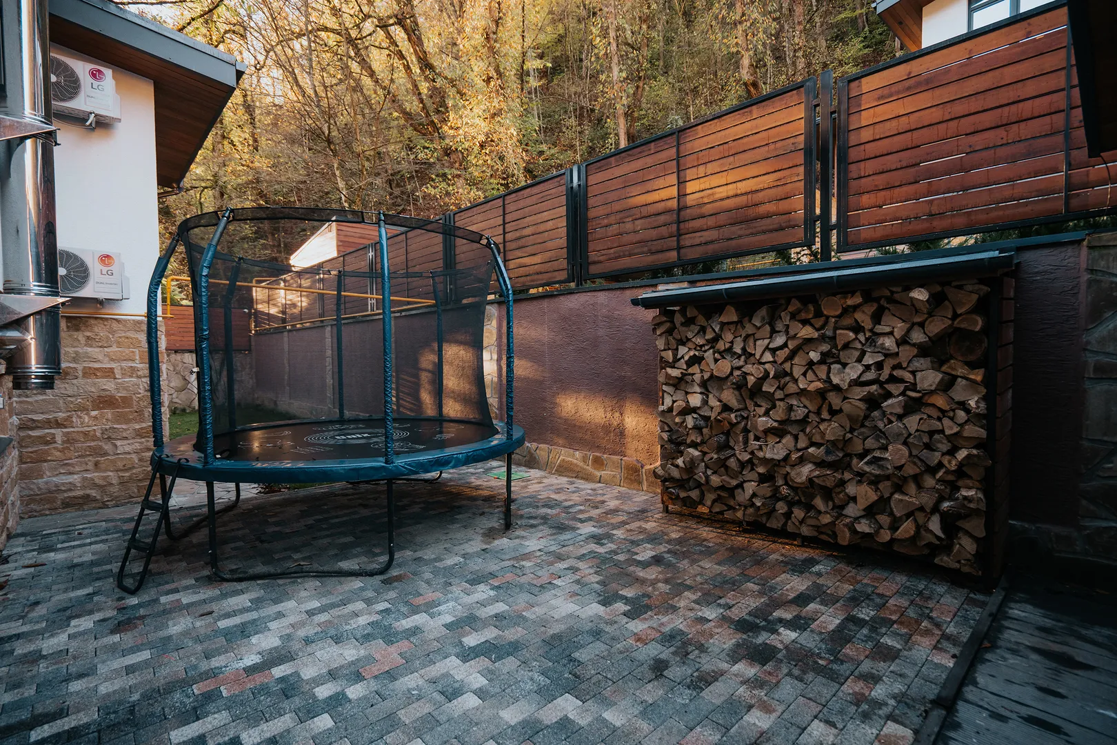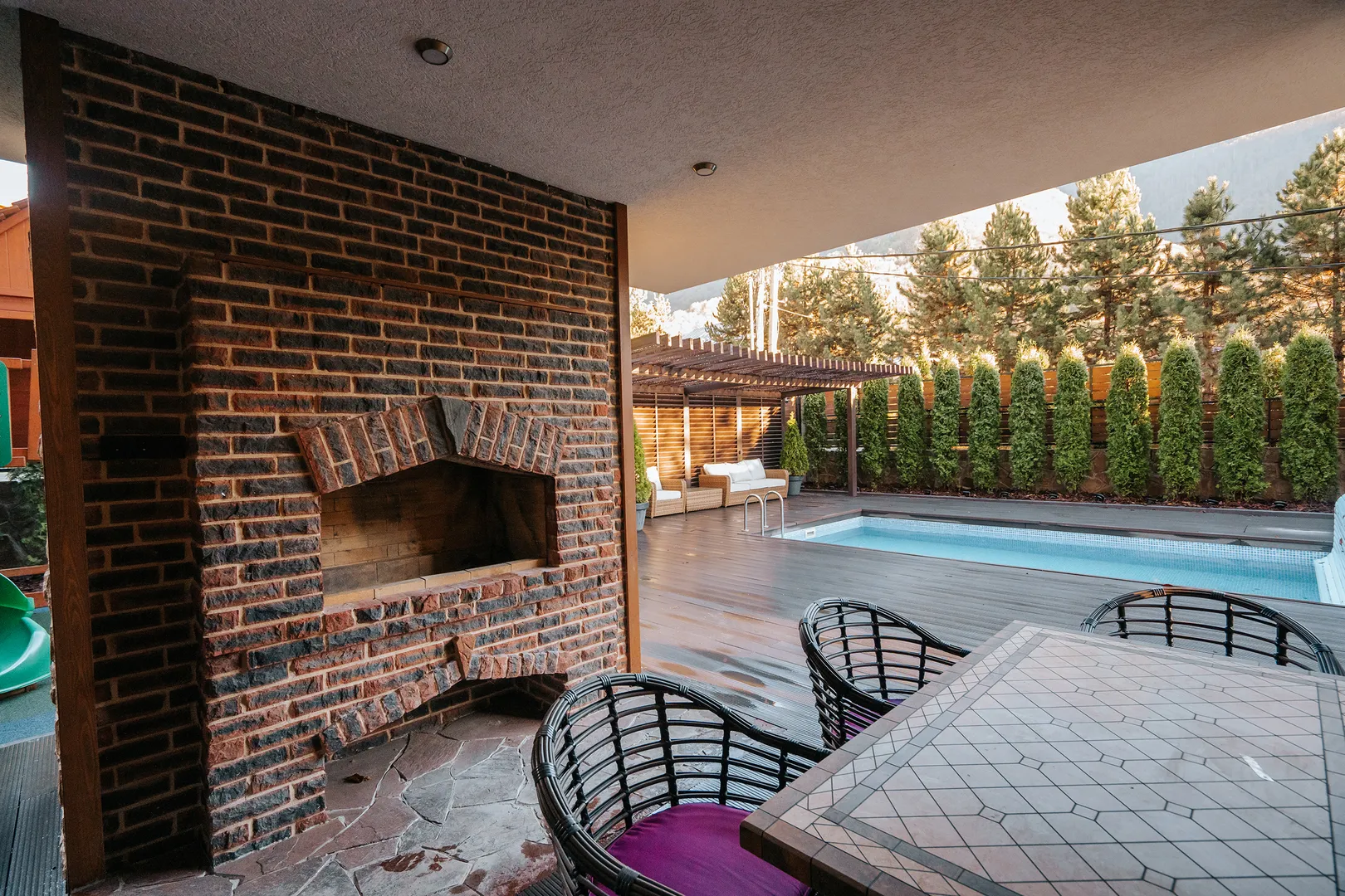 Мангальная зона со столом из мрамора. Русская дровяная баня. Бассейн с подогревом. Зона отдыха. Детская игровая площадка. Батут.