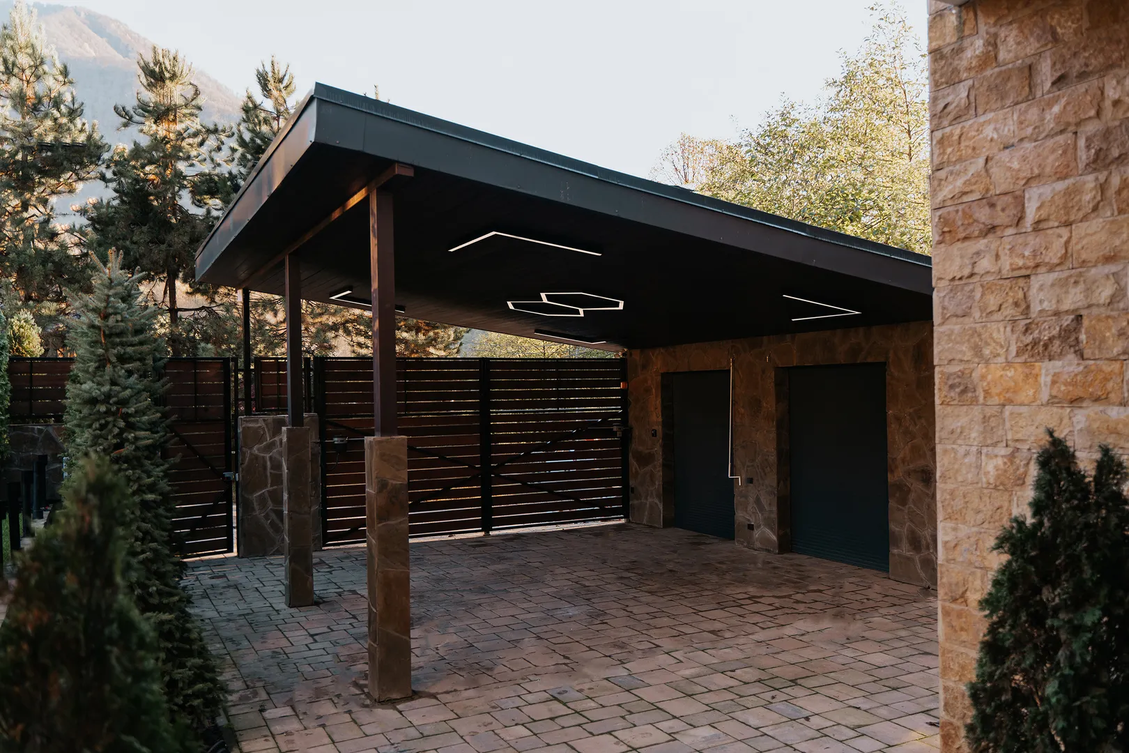 Двор дома озеленен, сделана фасадная и придомовая подсветка. Предусмотрен крытый паркинг во дворе и зона парковки перед домом. Видеонаблюдение по всему периметру дома.