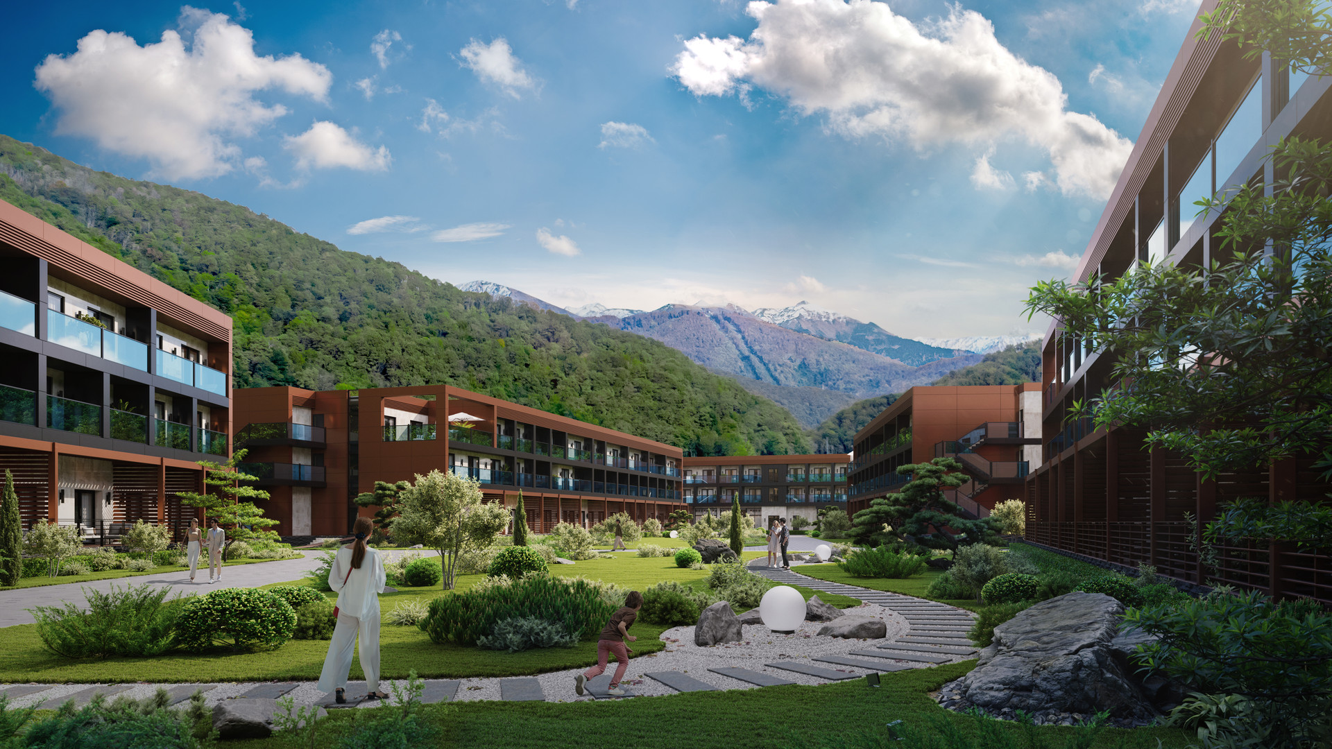 Концепция "город в городе" подразумевает в себе всё необходимое для комфортного проживания. Расположение комплекса удобно для прибывающих, в связи наличием моста с территории до железнодорожной станции "Эсто - Садок" обеспечивающий доступ на поезде "Ласточка" до Сочи и обратно.  На территории  круглогодичный подогреваемый бассейн с барным обслуживанием, шезлонгами, банный комплекс, ресторан, ночной клуб, зона кальяна, сцена на массовых мероприятий, конференц-зал для проведения бизнес встреч, прокат горнолыжного инвентаря,  велосипедов/самокатов, детская комната с услугами няни, воркаут площадку. Комплекс располагает набережной вдоль горной реки «Мзымта», с зонами отдыха. 80 машиномест на закрытой охраняемой территории. В нескольких минутах ходьбы находятся известное «Казино Сочи». Неподалеку от отеля находится канатная дорога "Горная Карусель". В 5 минутах от отеля расположен ТЦ "Горки-Молл".
