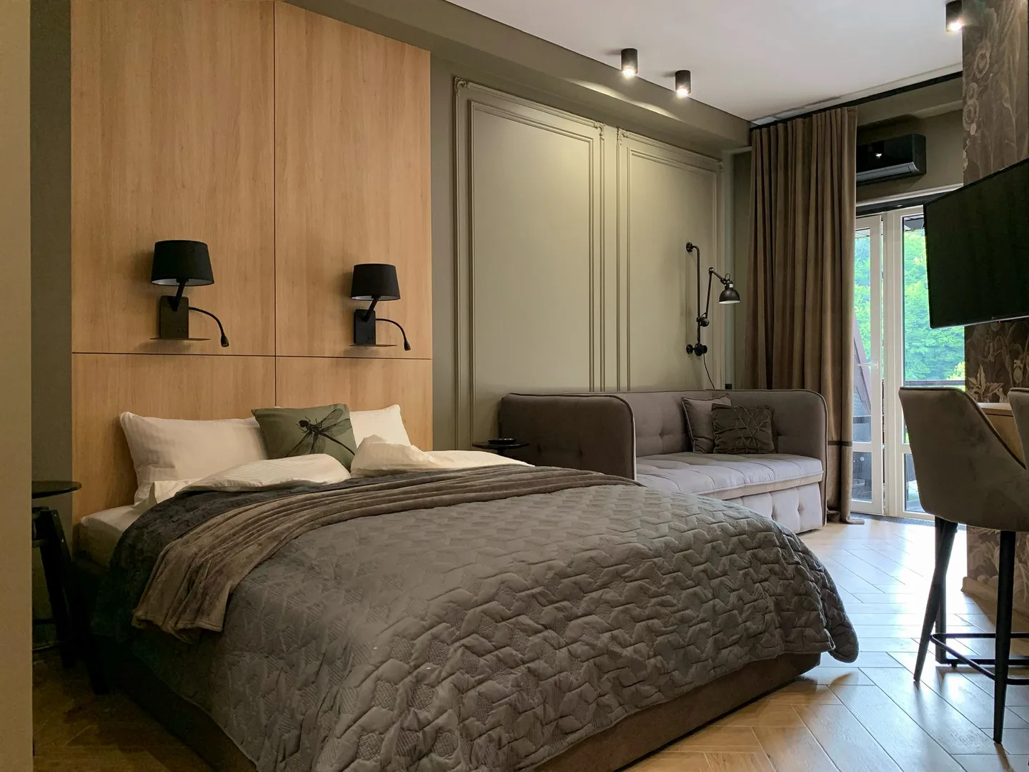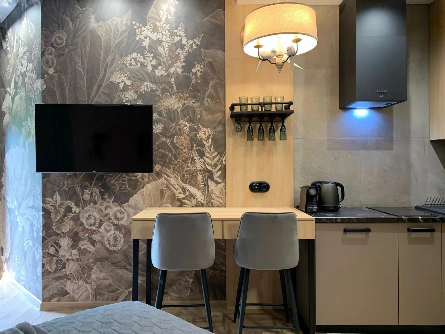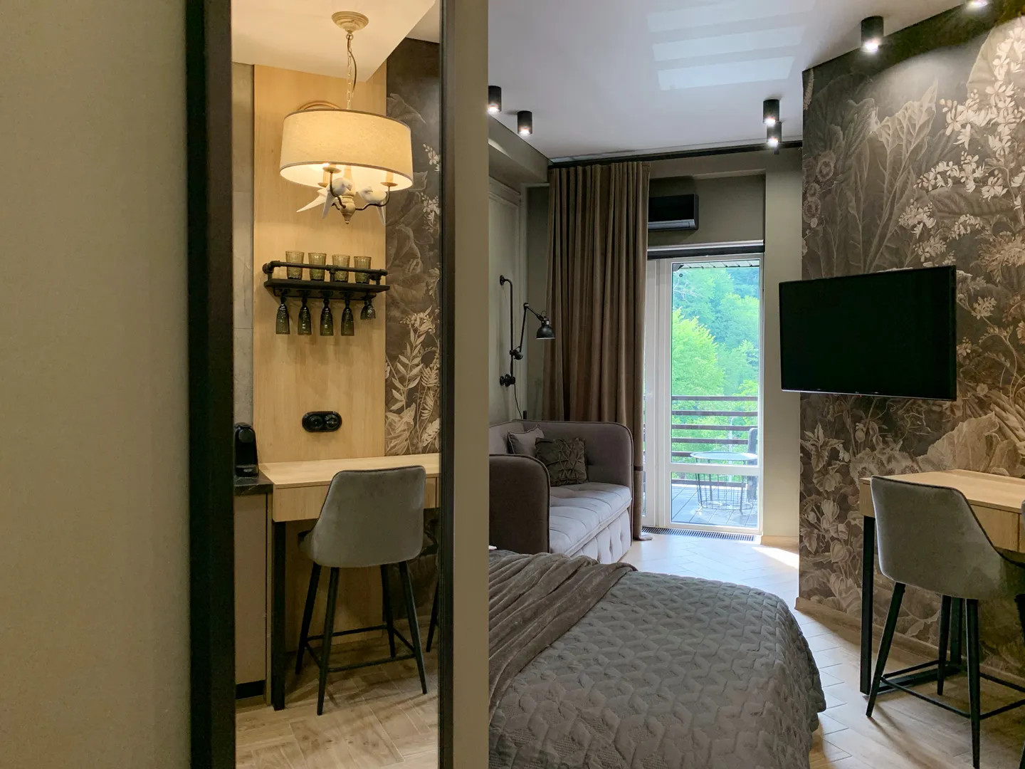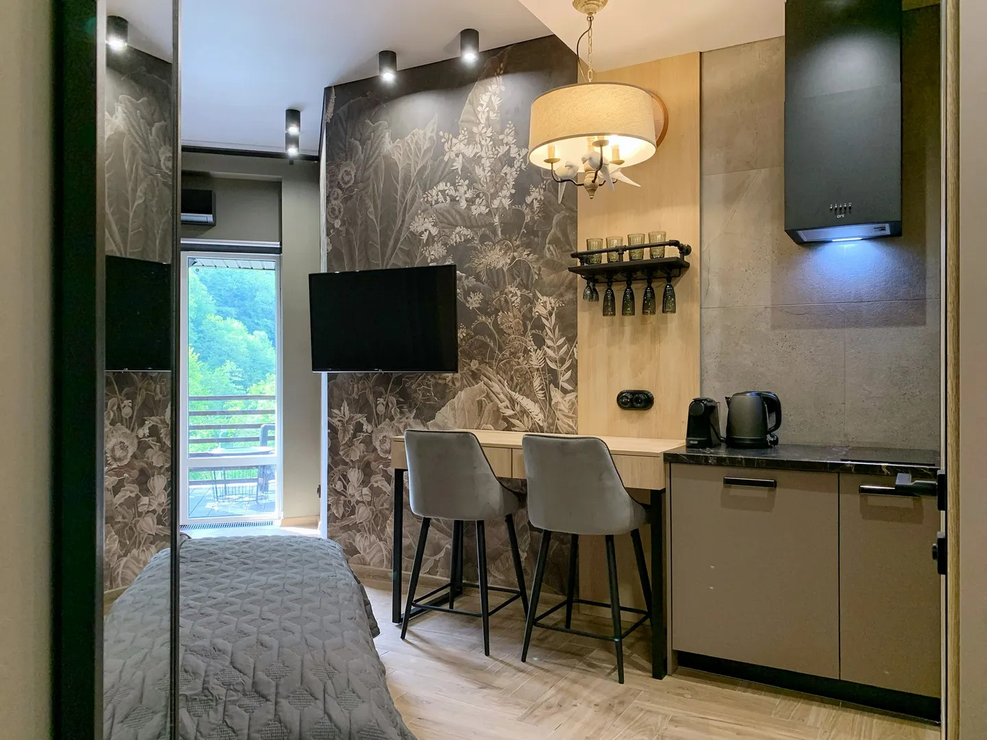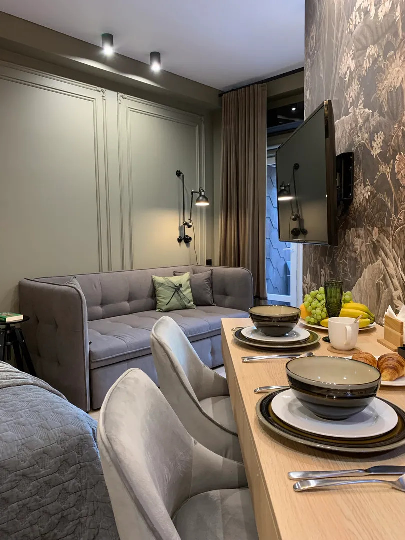 Квартира 35м с балконом и кухонной зоной на 6 этаже ЖК «Зимняя сказка» в ПГТ Красная Поляна на ул. Турчинского с видом на горные вершины и лес, с птицами по соседству.