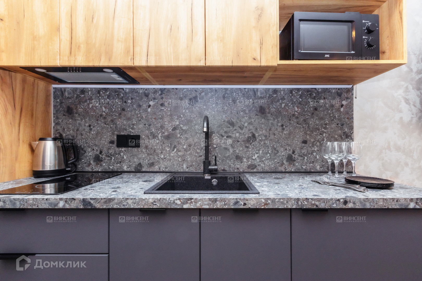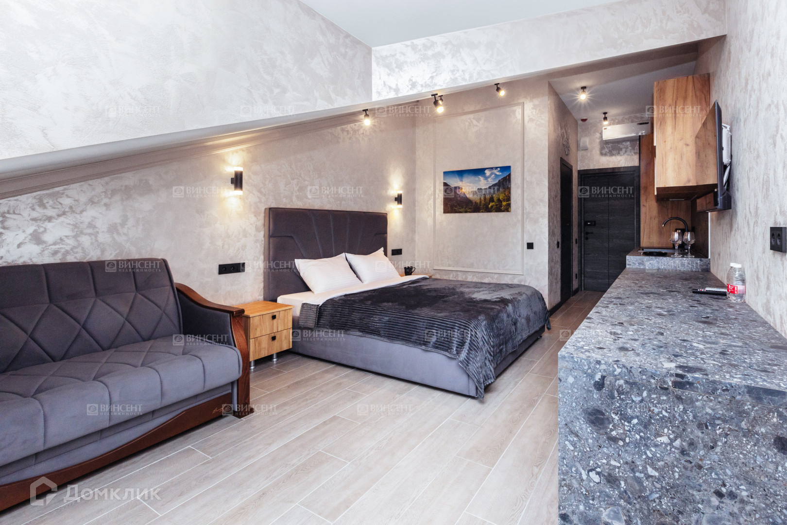 Внутри апартаментов вы найдете все необходимое для комфортного проживания. В отдельно обособленной зоне располагается просторная кровать и дополнительный диван, а также функциональная зона кухни.
