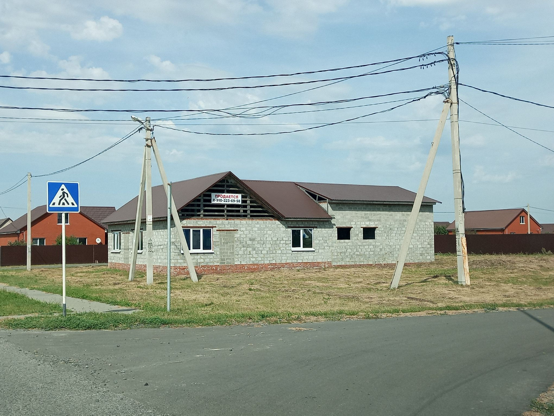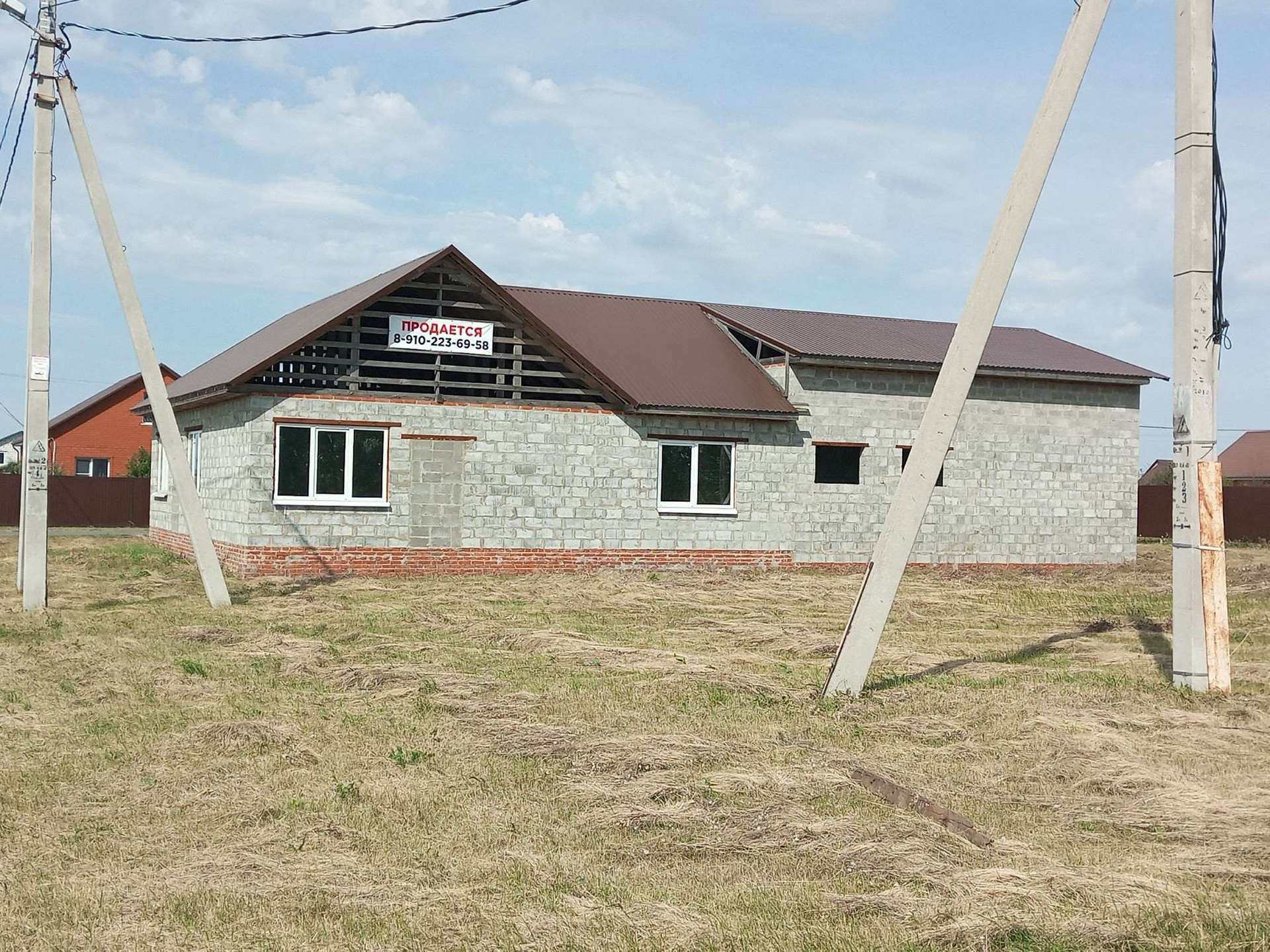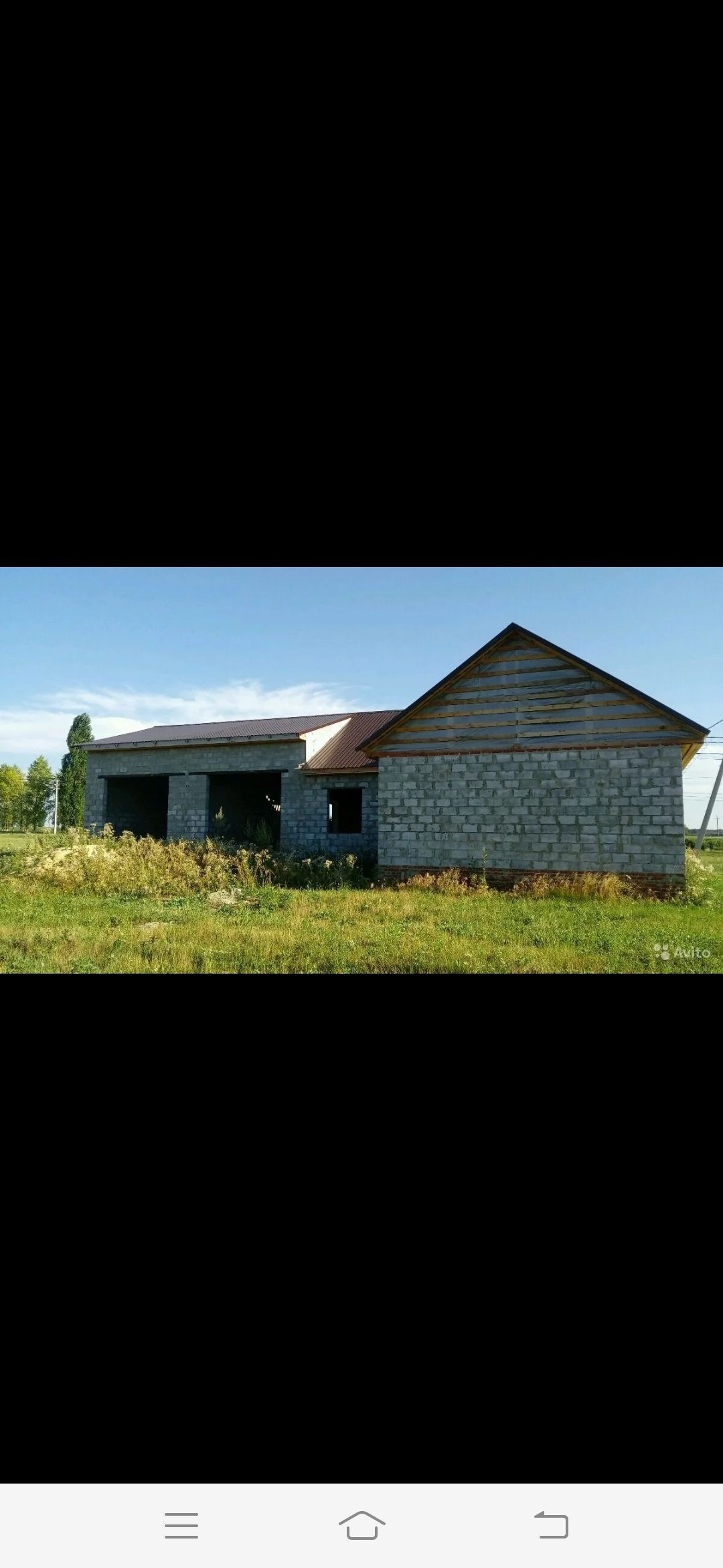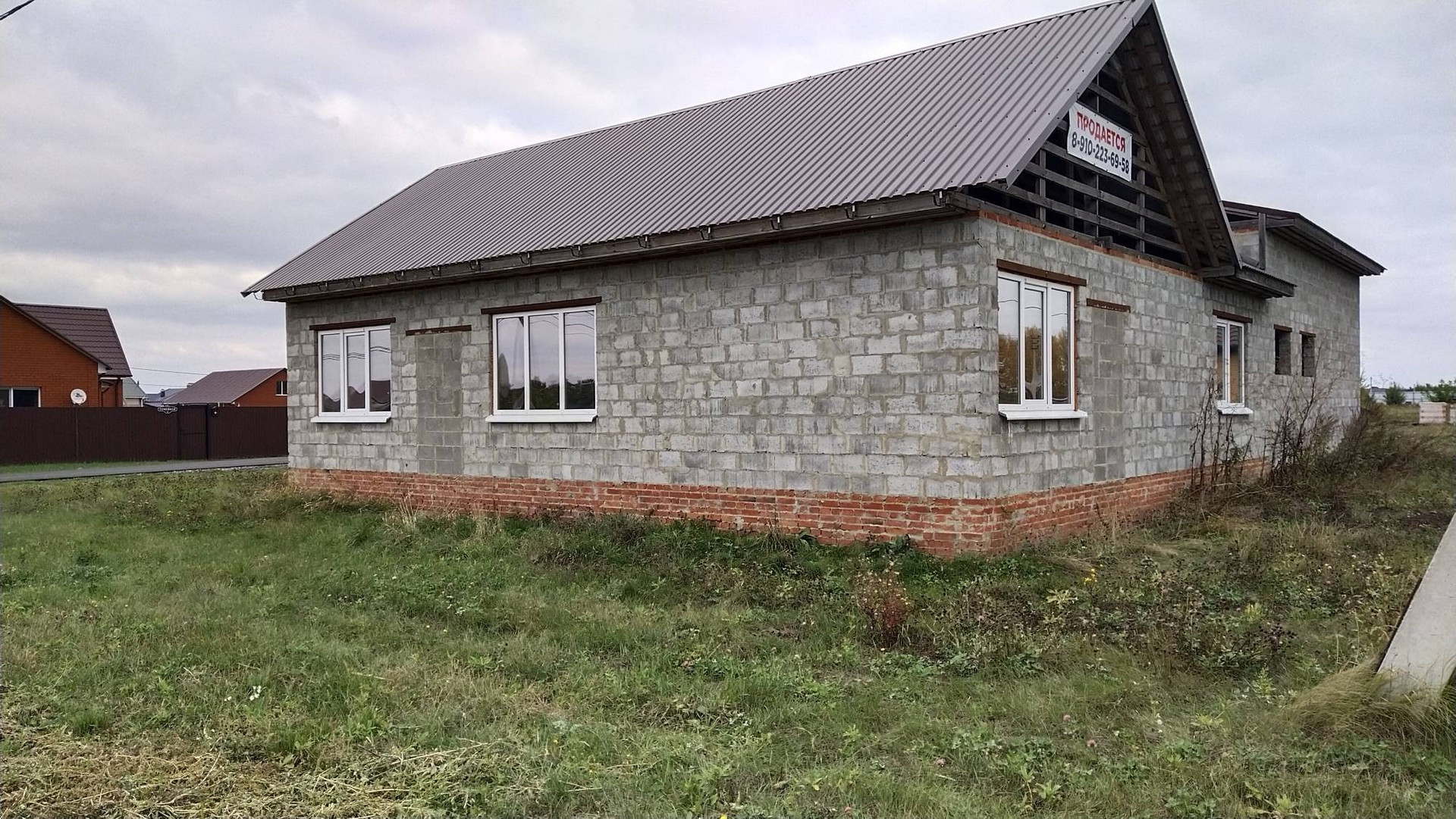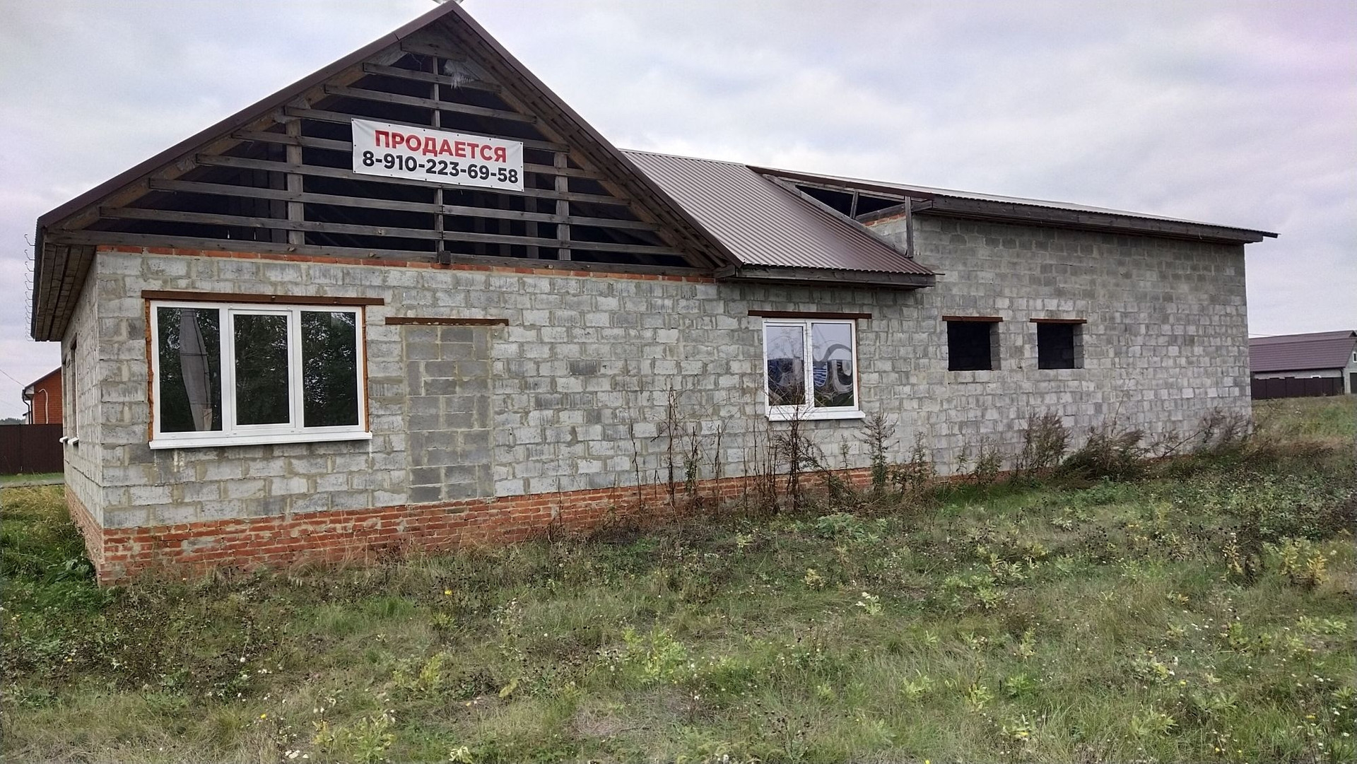 Продаётся объект незавершенного строительства.  В собственности. Общая площадь с гаражами 141 кв.м.  В доме две спальни, большая гостиная совмещённая с кухней, сан.узел раздельный, прихожая. Два больших гаража под грузовые машины, 8 м. в длину. Перекрытия потолков деревянные, стены из Белгородского керамзитоблока, крыша металлопрофиль фирмы Профсталь, фундамент монолитный бетон 2 м. Участок земли 800 кв.м. в аренде. Коммуникации рядом, но подводом не занимались, это не дорого, но нет на это времени. На данный момент установлены пластиковые окна и двери. Строили для себя под свои потребности и машины.