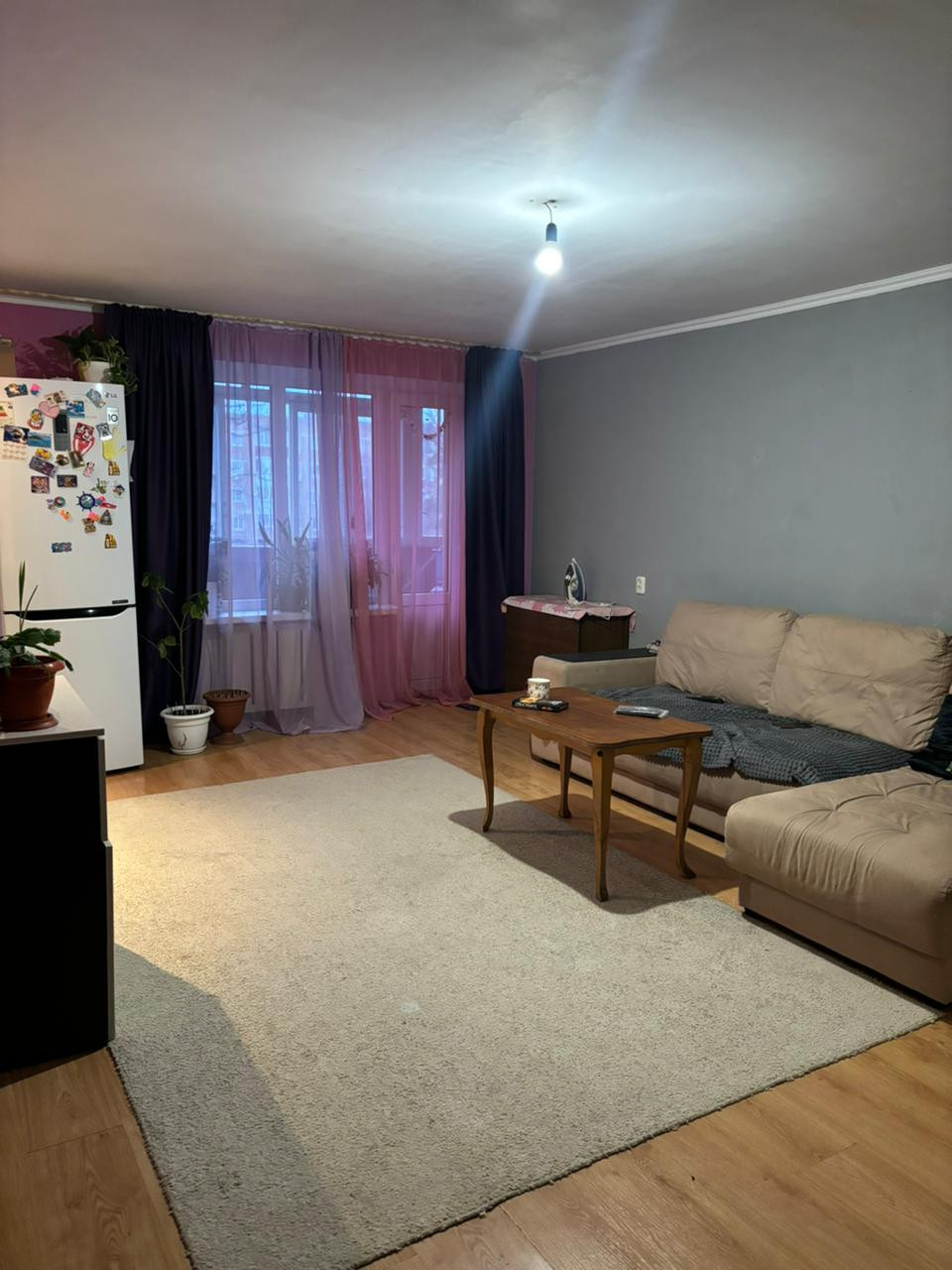 Трех комнатная квартира, сделана перепланировка, совмещены коридор, кухня, гостинная в одной большой комнате, две изолированные спальни, стены, потолок гипсокартон, на полу ламинат, мощная металлическая входная дверь, водонагревательная колонка, оплата только за отопление, горячая вода есть всегда, плата за газ фиксированная, санузел совмещенный, окна выходят и во двор и на другую строну, чугунная ванна нового образца, санузел также, при перепланировке был немного увеличен для установки стиральной машины, балкон отделан деревом, застеклен