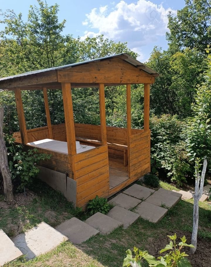 - деревянная беседка со столом и скамейками, и рядом расположенной мангальной зоной;