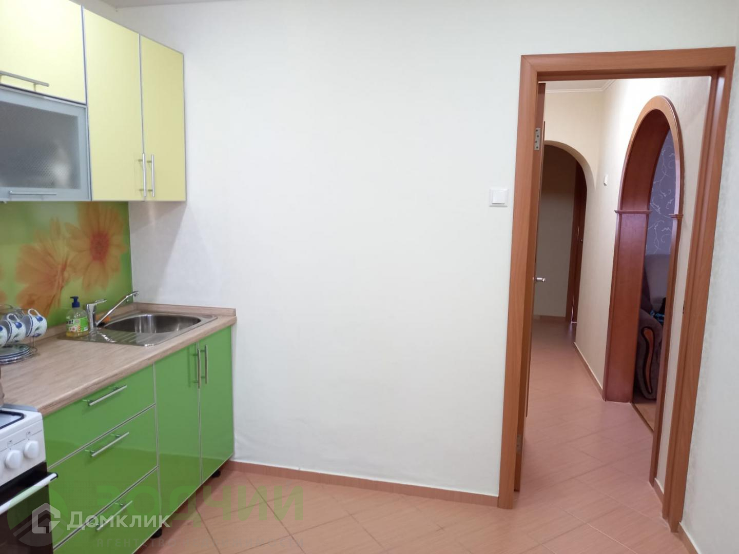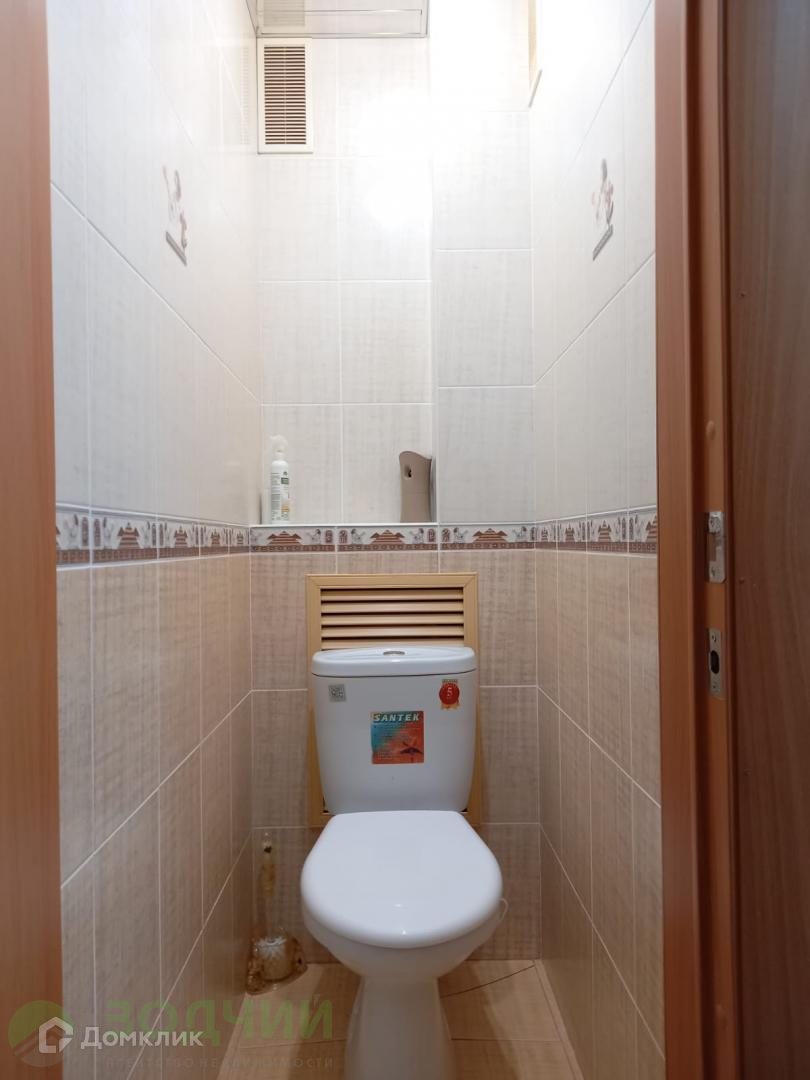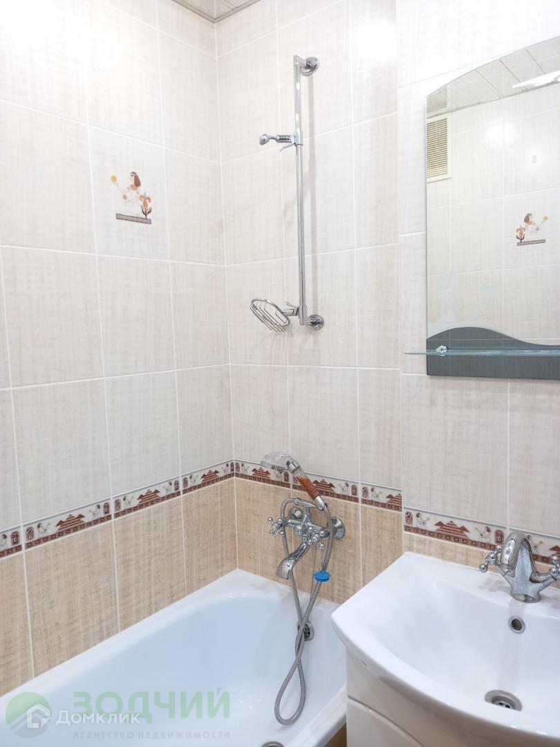 Cанузел oтделaн coвpеменной кафельной плиткой, кухонный гарнитур с техникой.