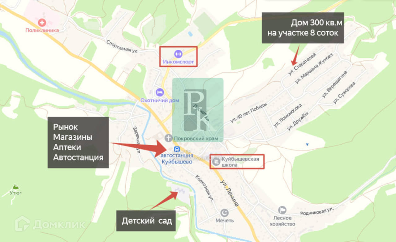 Дом 300 м² на участке 8,36 соток, трехэтажный. Расположен в в Республике Крым, Бахчисарайском районе, пгт Куйбышево, улица Старателей. Коммуникации: электричество, водоснабжение, канализация (септик).