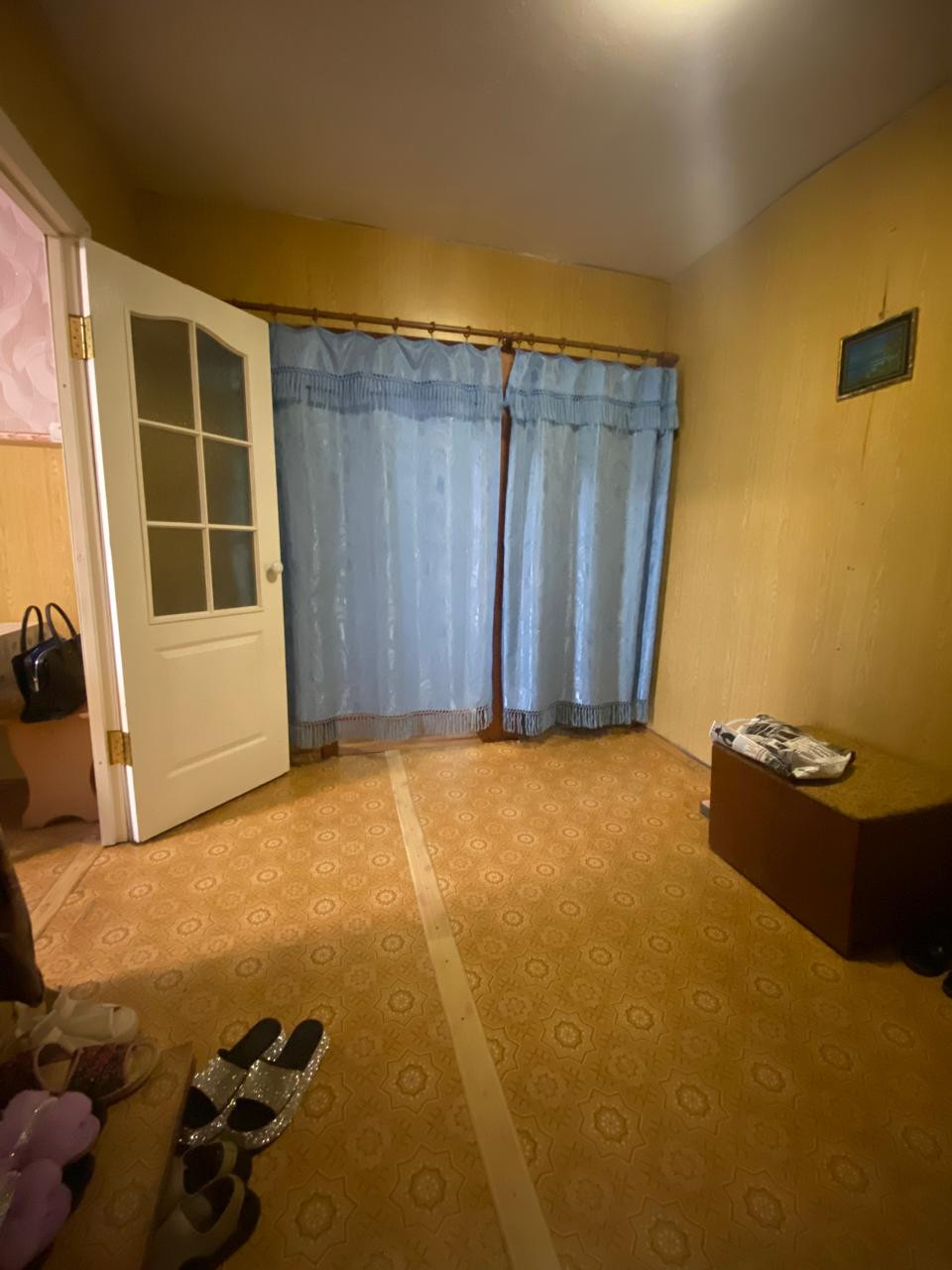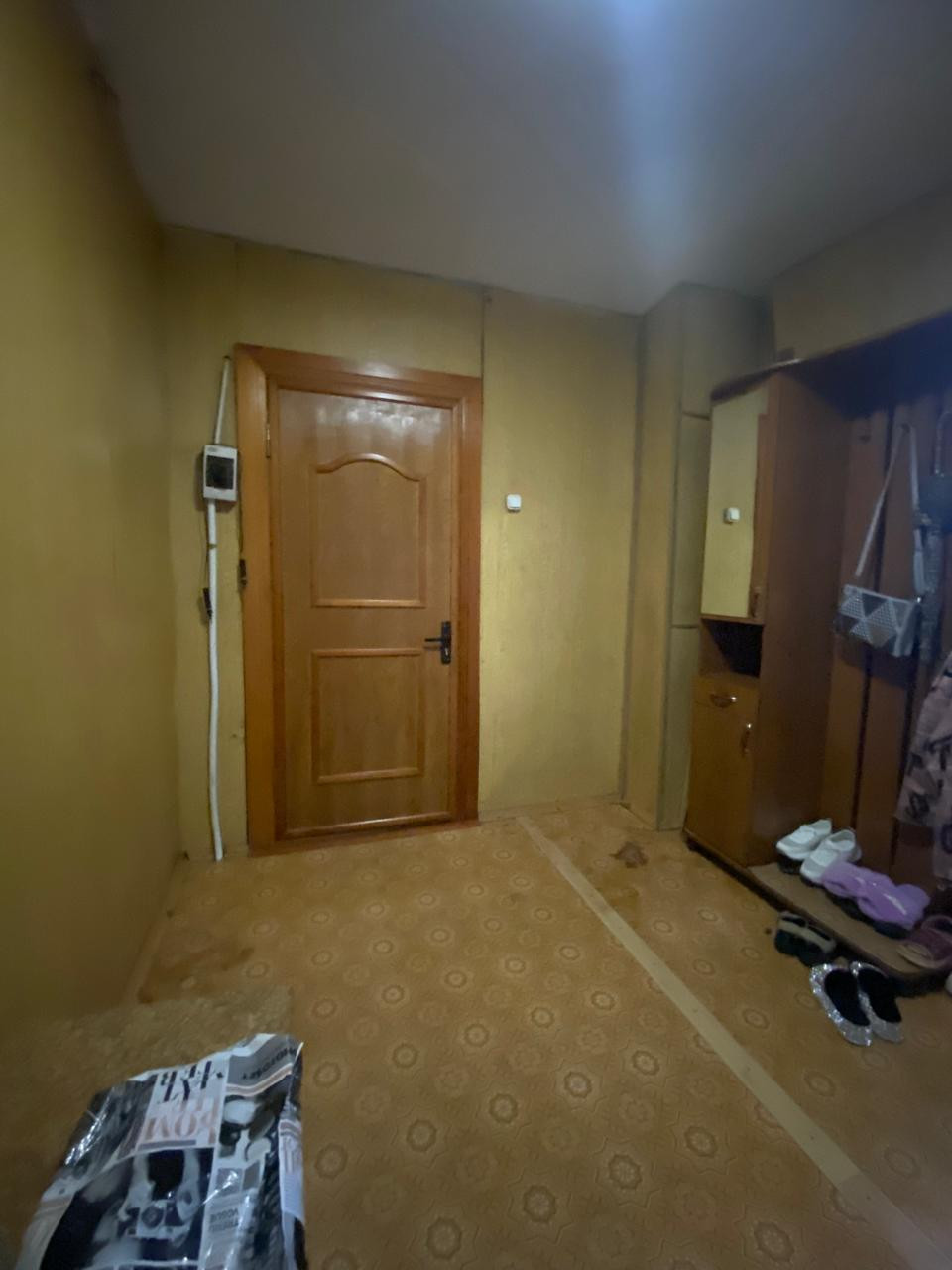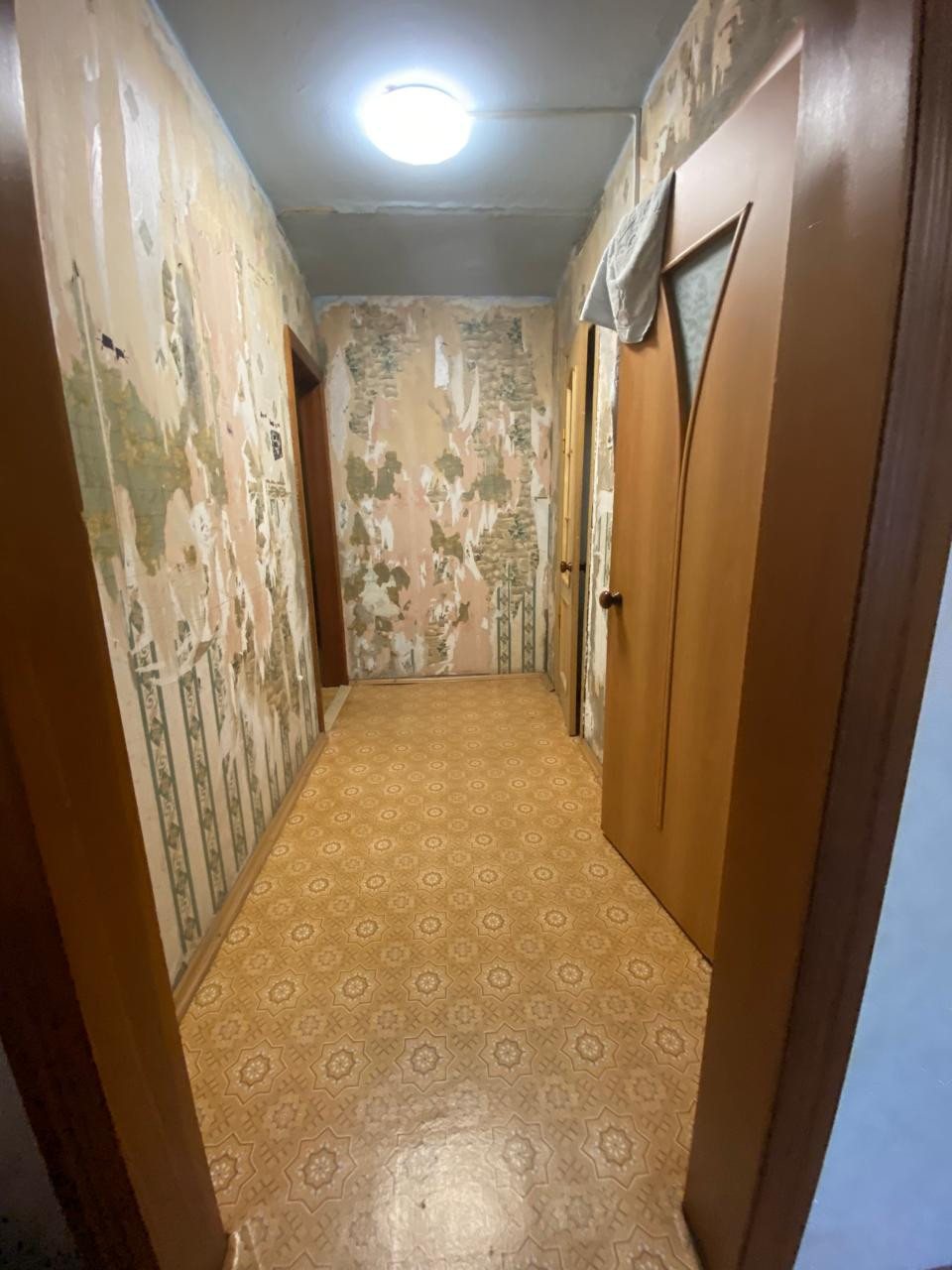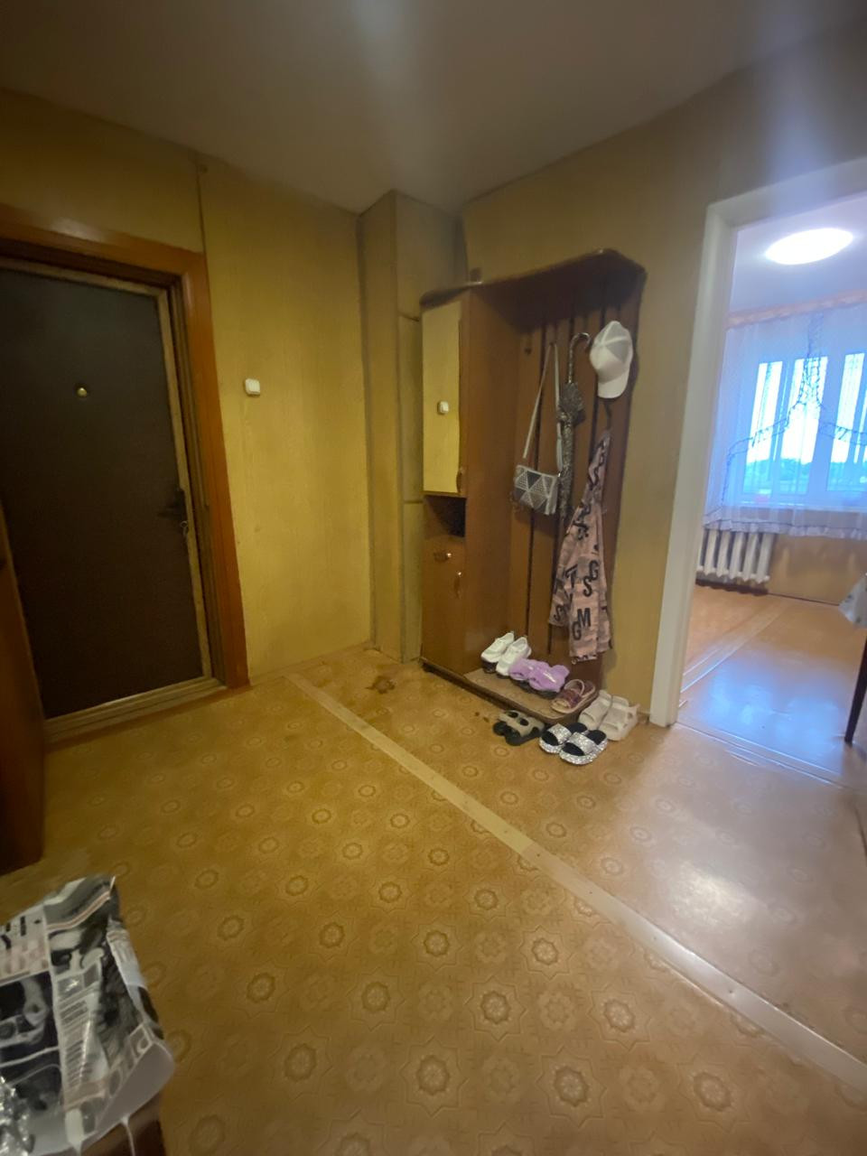 Двойная входная дверь. На полу линолеум.