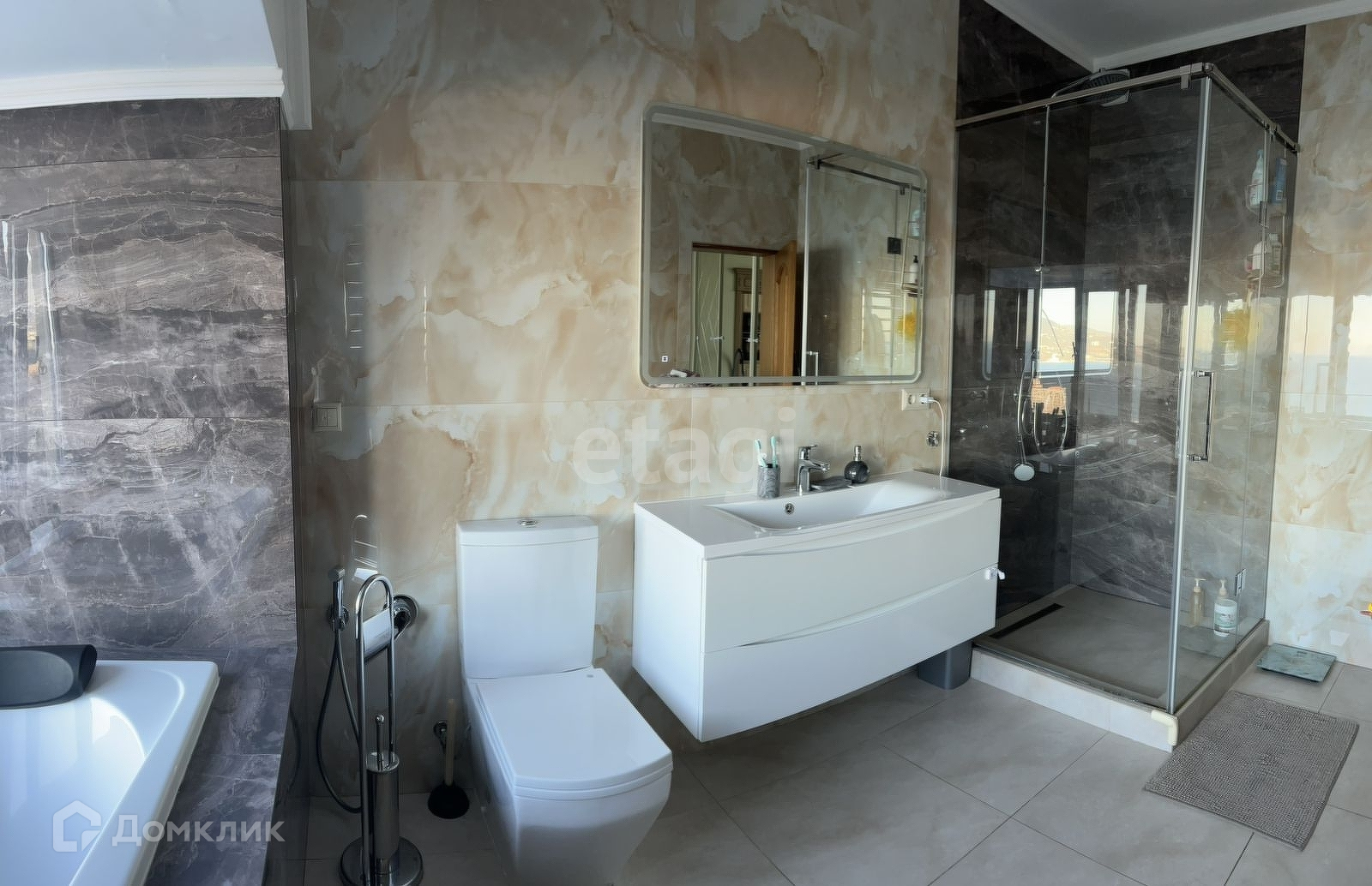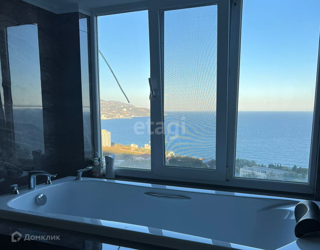 Ванная комната заслуживает отдельного восторга, с красивейшим видом на море и горы, с наблюдением от заката до рассвет, а ночная красота Ялты имеет свой неповторимый шарм.