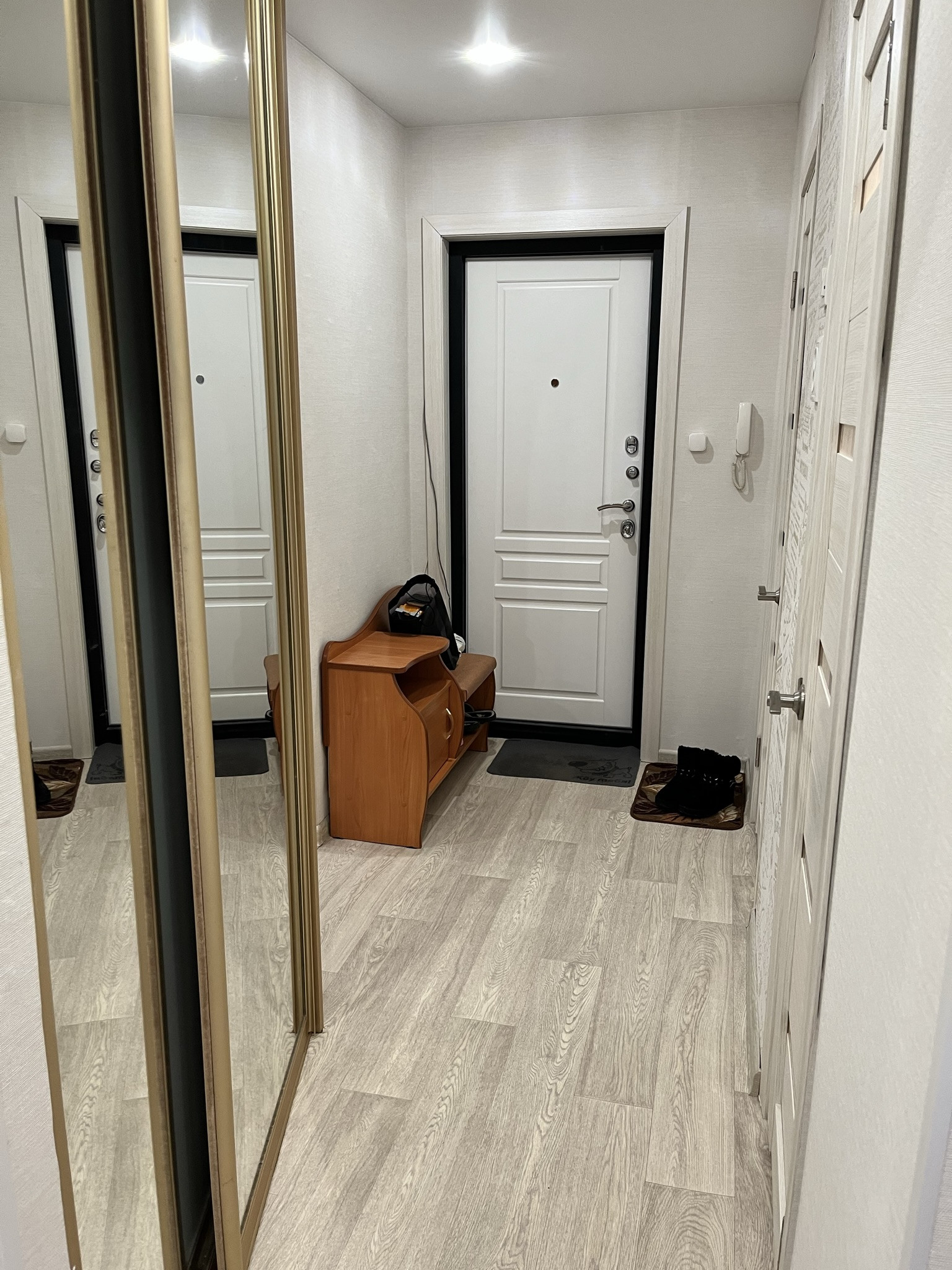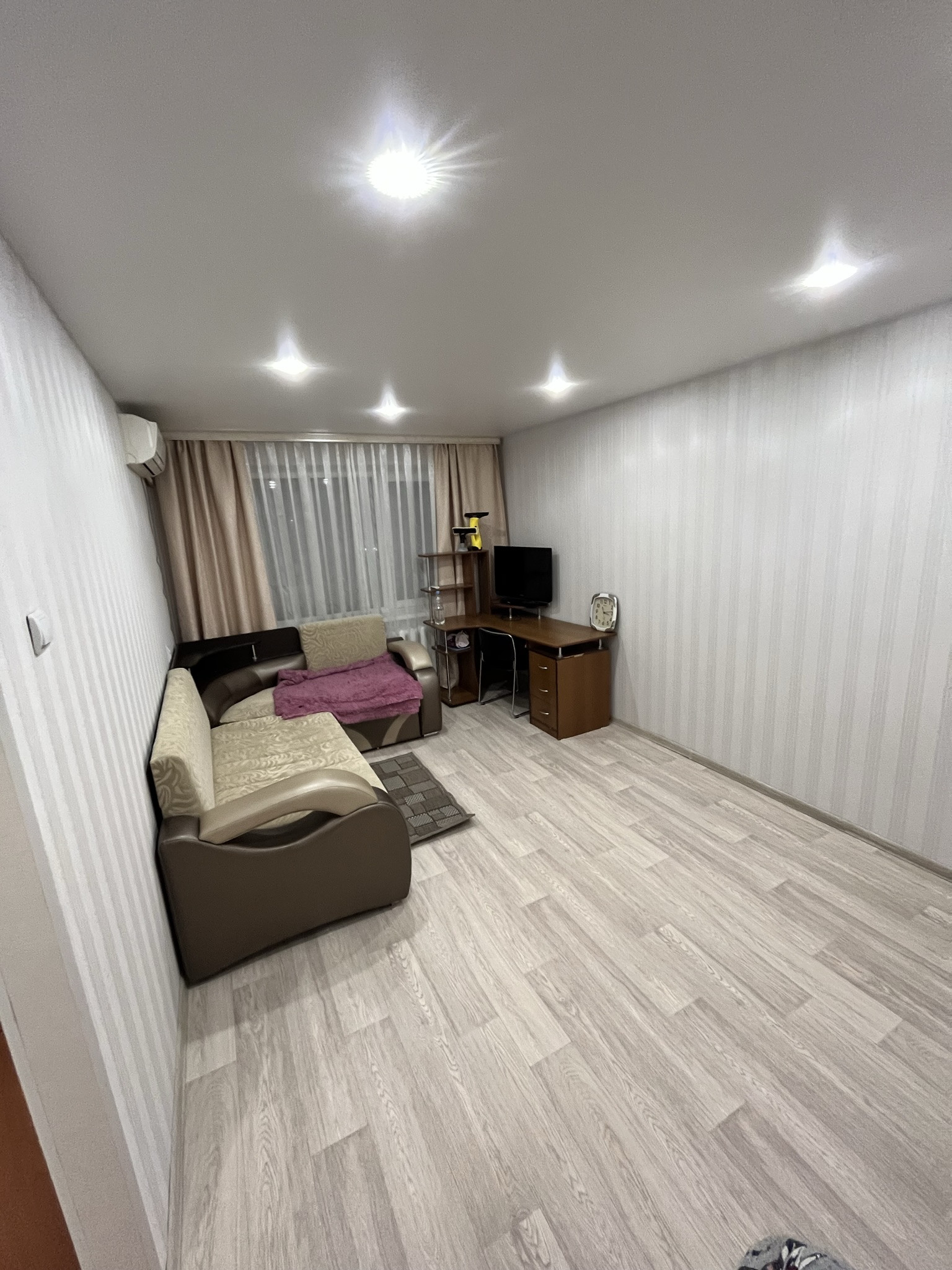 Застекленный балкон. Хорошие входная, межкомнатные двери. Кондиционер. Натяжные потолки везде, кроме санузла. В прихожей стены выровнены ГКЛ.