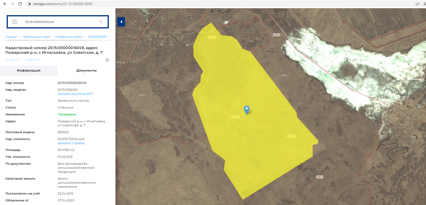 -Участок 374,2 га (25:15:000000:6049) находится рядом с трассой М-60 (в собственности, двухконтурный 150 и 224.2 га).