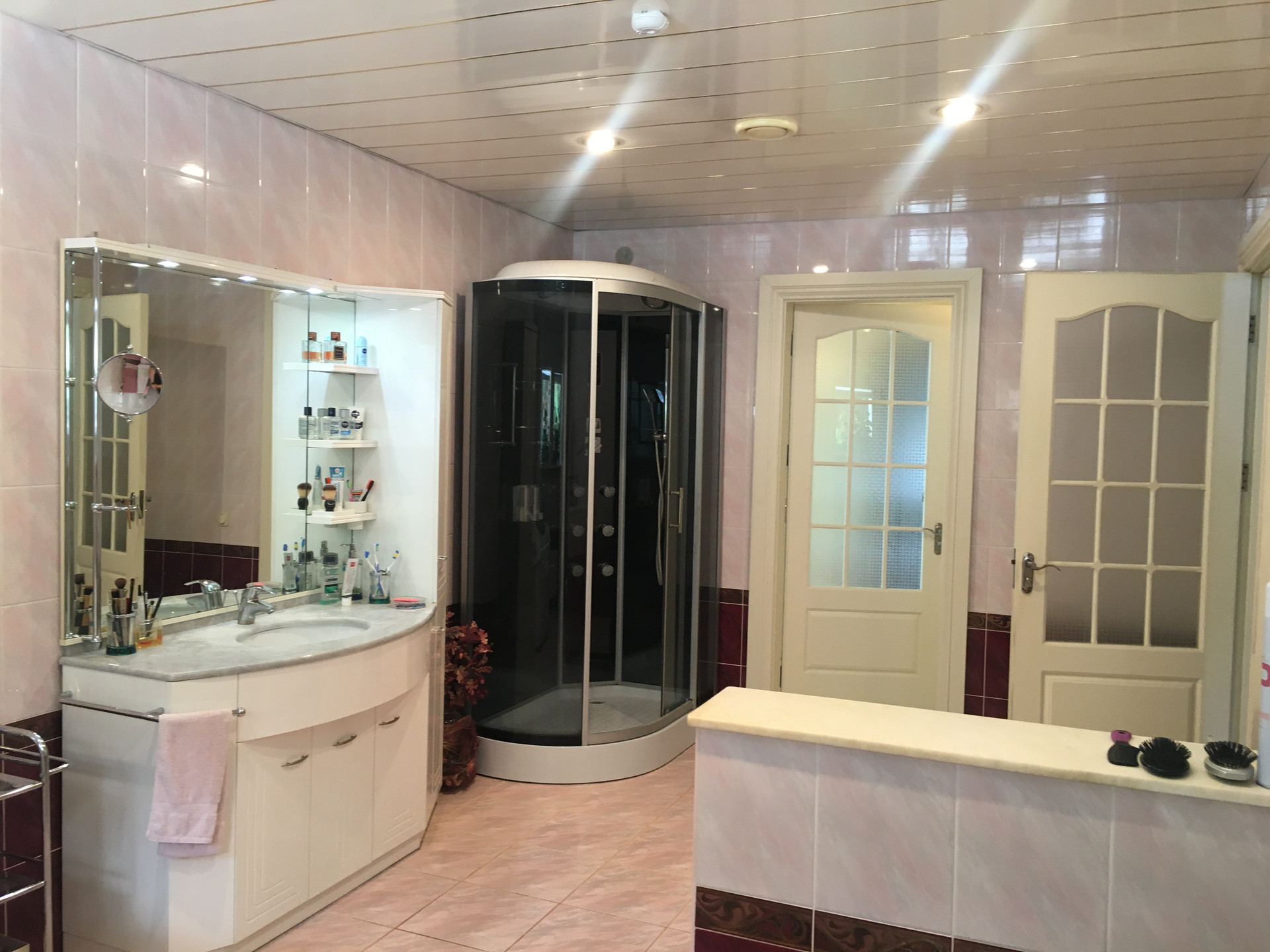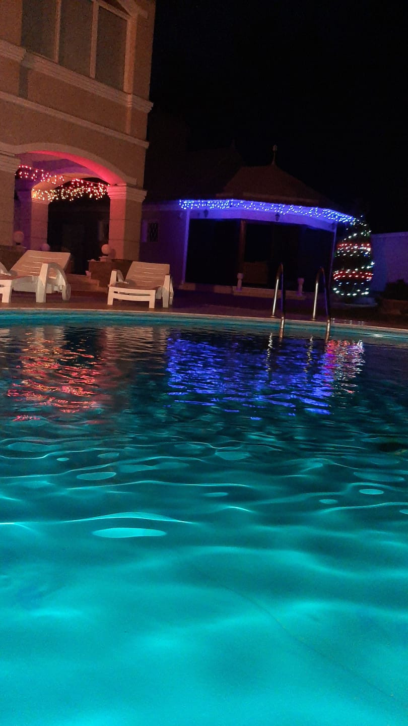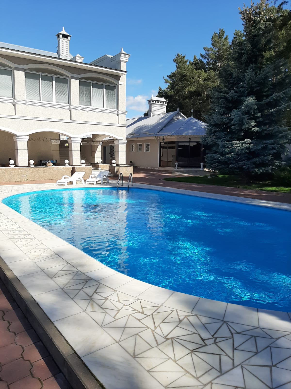Три бассейна -1 открытый перед домом, -2ой внутри гостевого дома с сауной и третий с массажной системой джакузи в закрытом помещении с витражным остеклением.