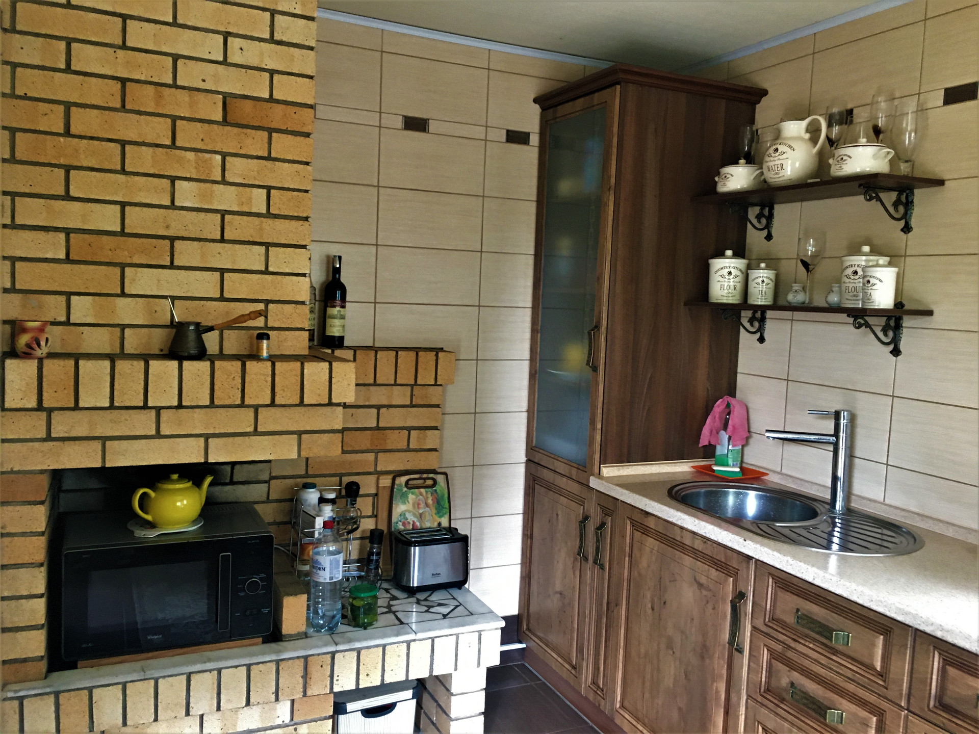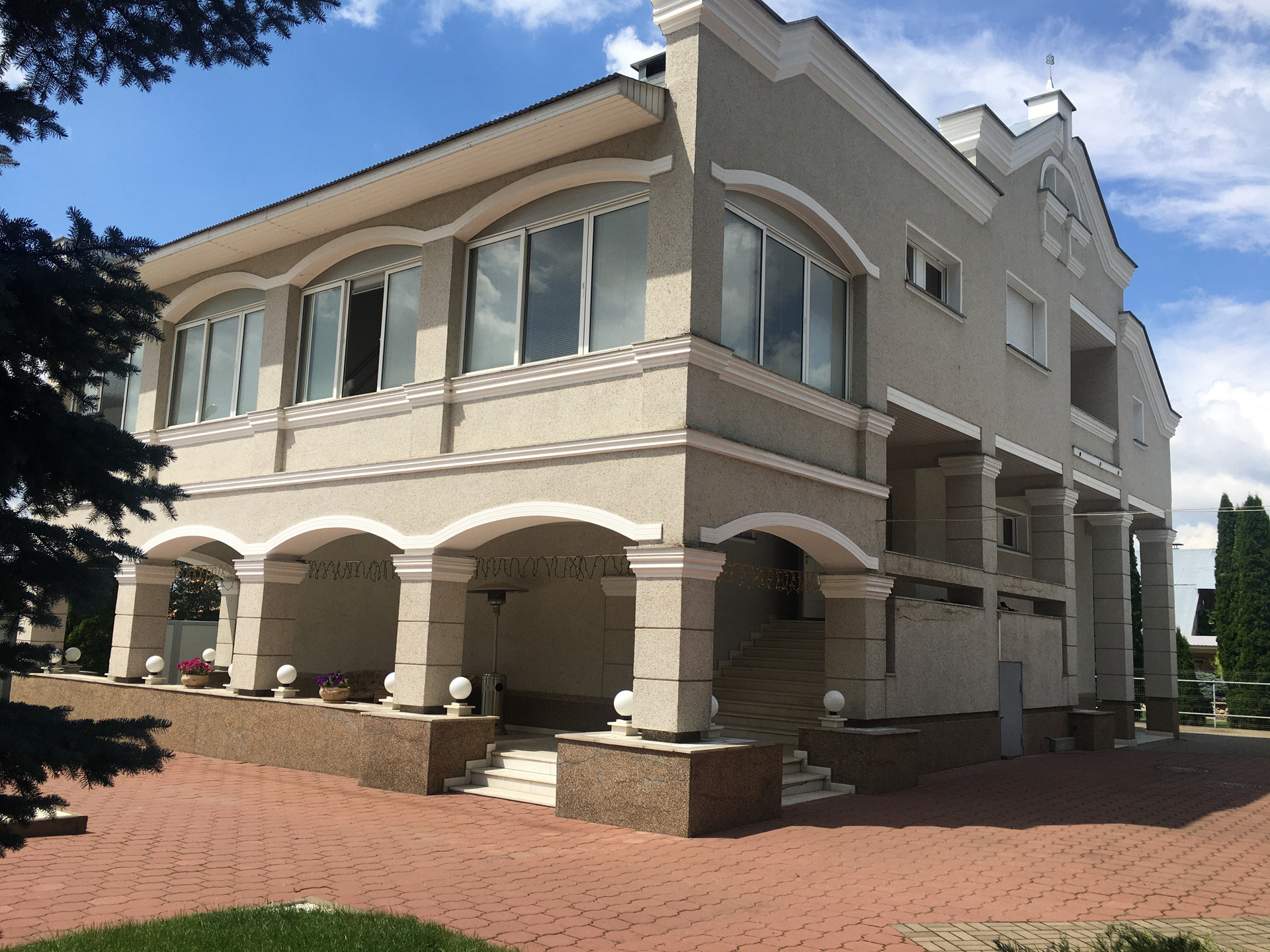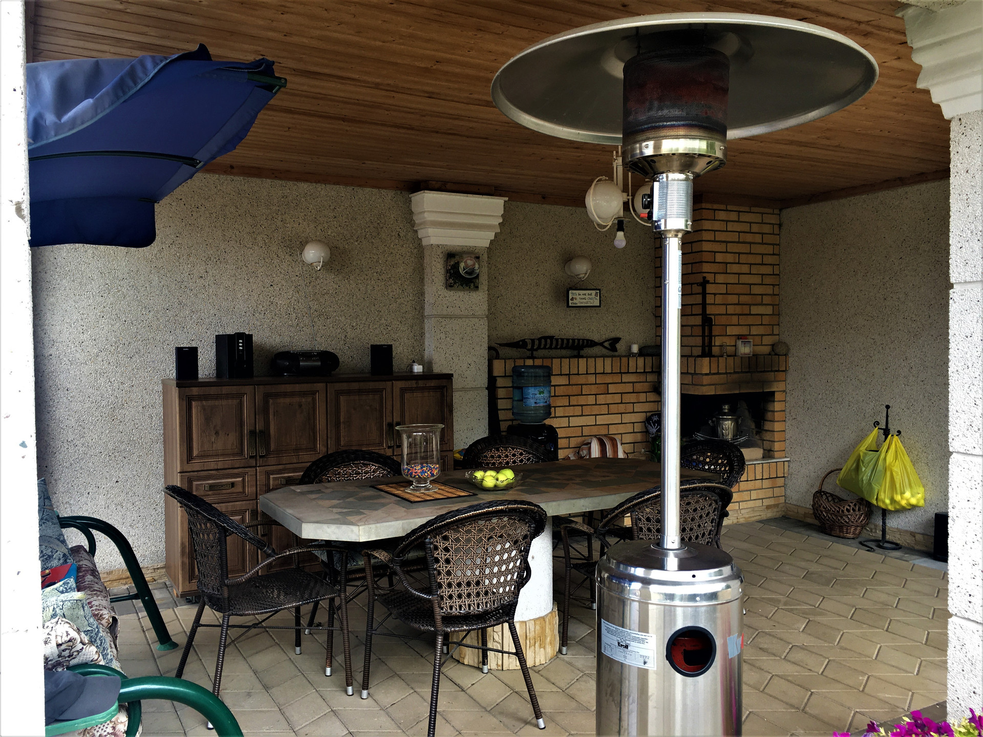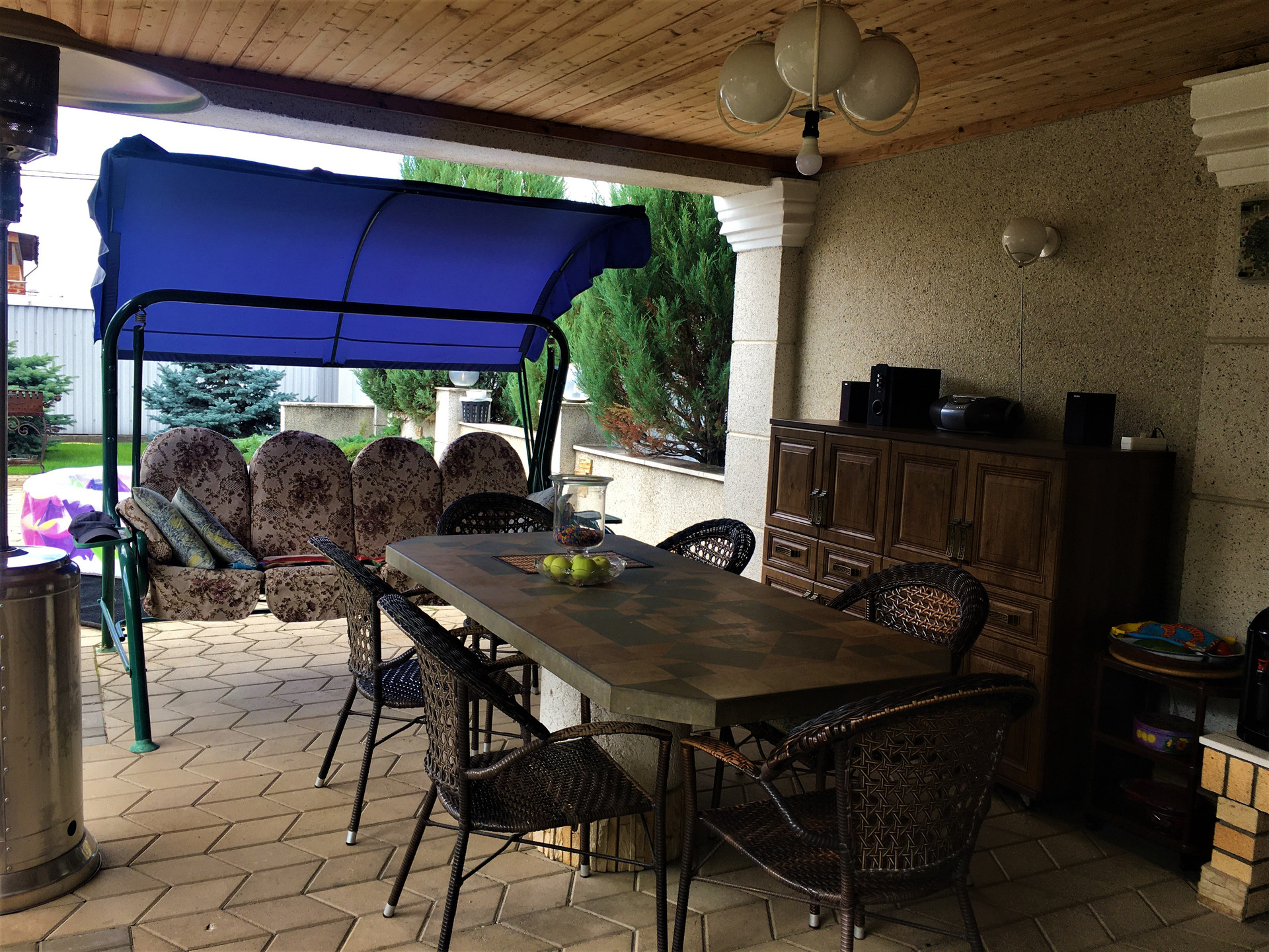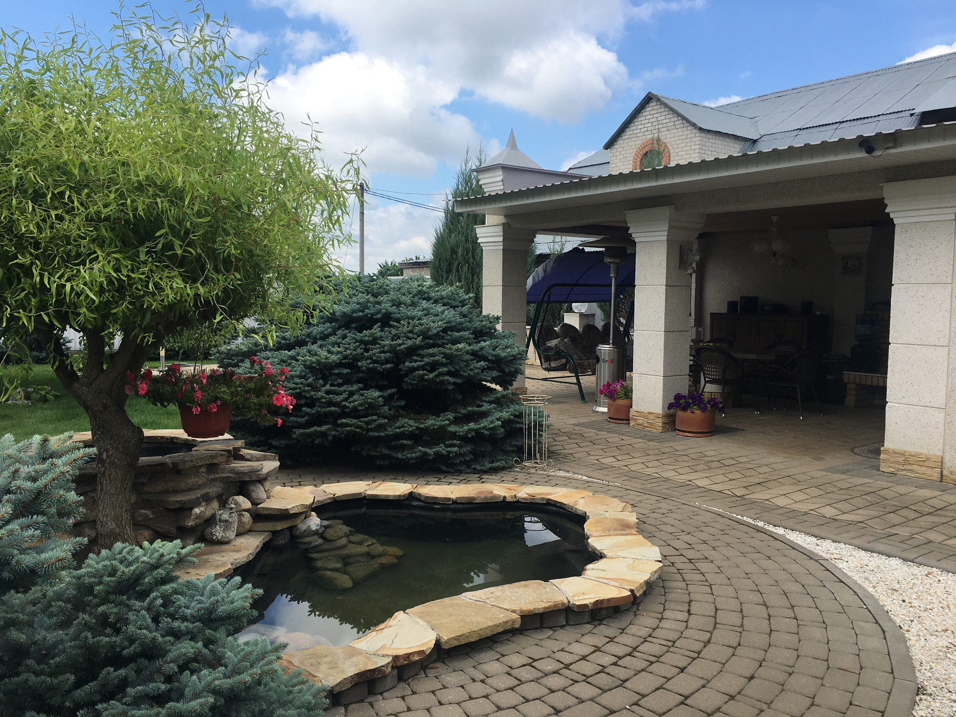 На 27 сотках расположено- летний или гостевой дом с кухней, спальней бассейном и сауной. Летняя кухня в помещении и зона отдыха под крышей с камином и зоной барбекю.