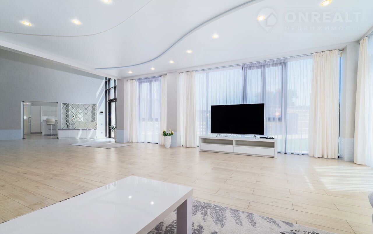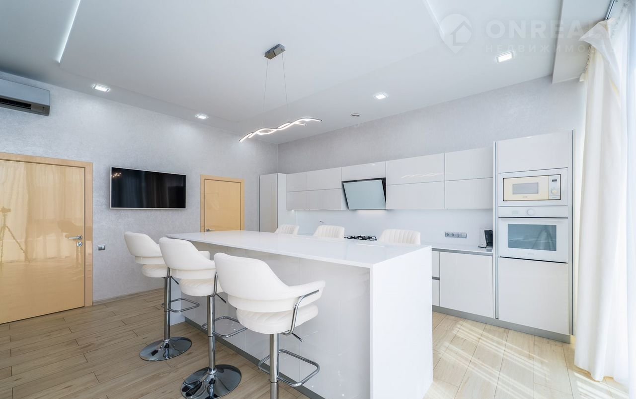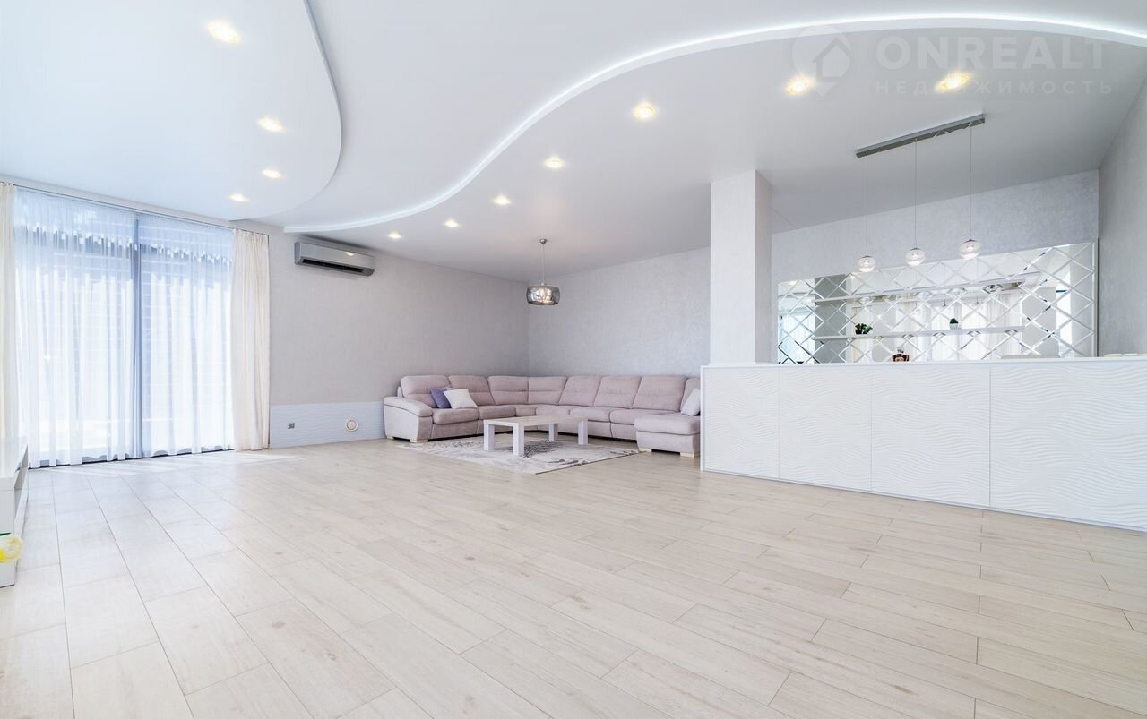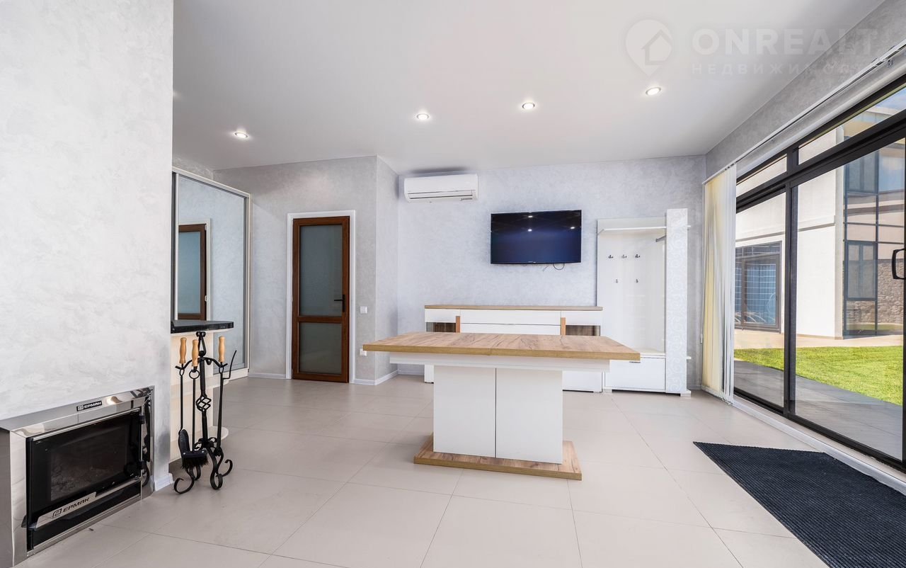 Первый этаж: прихожая с гостиной (67 кв.м), кухня со встроенной мебелью светлых тонов (31,6 кв.м), санузел, гардеробная и выход к бассейну.