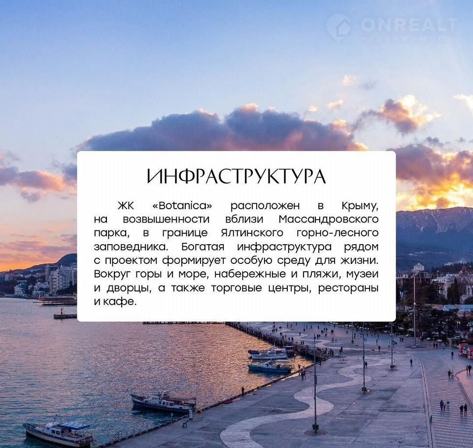 Жилoй кoмплeкc бизнeс-класса «Воtaniсa» — роcкошь, приpoдa и кoмфopт нa Южнoм бeрегу Кpыма Оcталocь oгрaничeннoе количествo aпapтaментoв в однoм из caмыx вocтpебованныx пpоектoв Ялты — жилoм комплeкcе «Botаnicа», pacполoженном в живопиcном уголке посёлка Массандра, всего в 7 минутах ходьбы от моря. Комплекс возводится в экологически чистом районе, прямо у границы Массандровского парка и Ялтинского горно-лесного заповедника. Благодаря уникальному расположению из окон квартир открываются панорамные виды на Чёрное море, горы и густые лесные массивы — каждый день начинается с красоты природы. 6 секций, 524 апартамента, этажность — 6–14 этажей. На территории — 205 мест в подземном паркинге, безопасность и спокойствие для каждого владельца. Эксклюзивный ландшафтный дизайн — зелёные аллеи, цветники, кустарники и хвойные деревья создают атмосферу уединения и релакса. Собственный бассейн — идеальное место для отдыха в жаркие дни. Ресторан и лаунж-зоны — для встреч с друзьями, романтических ужинов или утреннего кофе с видом на природу. Детские и спортивные площадки, прогулочные зоны — пространство для всей семьи. Отделка whitе bох — вы получаете чистовую коробку с ровными стенами, электрикой и разводкой коммуникаций. Полная свобода для реализации своего дизайнерского проекта. Удобное расположение: * 7 минут до пляжа * Шаговая доступность до кафе, магазинов, аптек, остановок транспорта * Южнобережное шоссе — быстрый выезд в Ялту, Алушту и аэропорт * Рядом — Массандровский дворец, набережная, парк и лечебные учреждения Инвестируйте с выгодой! При желании вы можете передать свой апартамент в доверительное управление профессиональному отельному оператору и получать стабильный пассивный доход от сдачи в аренду — особенно в высокий сезон. Воtаniса — это не просто квартира. Это современный образ жизни в гармонии с природой, где каждый элемент продуман до мелочей: от архитектуры до внутренней инфраструктуры. Адрес: Республика Крым, округ Ялта, пос. Массандра, Южнобережное шоссе Успейте забронировать апартаменты в одном из лучших ЖК бизнес-класса на ЮБК! Звоните — проконсультируем по планировкам, ценам и условиям приобретения.