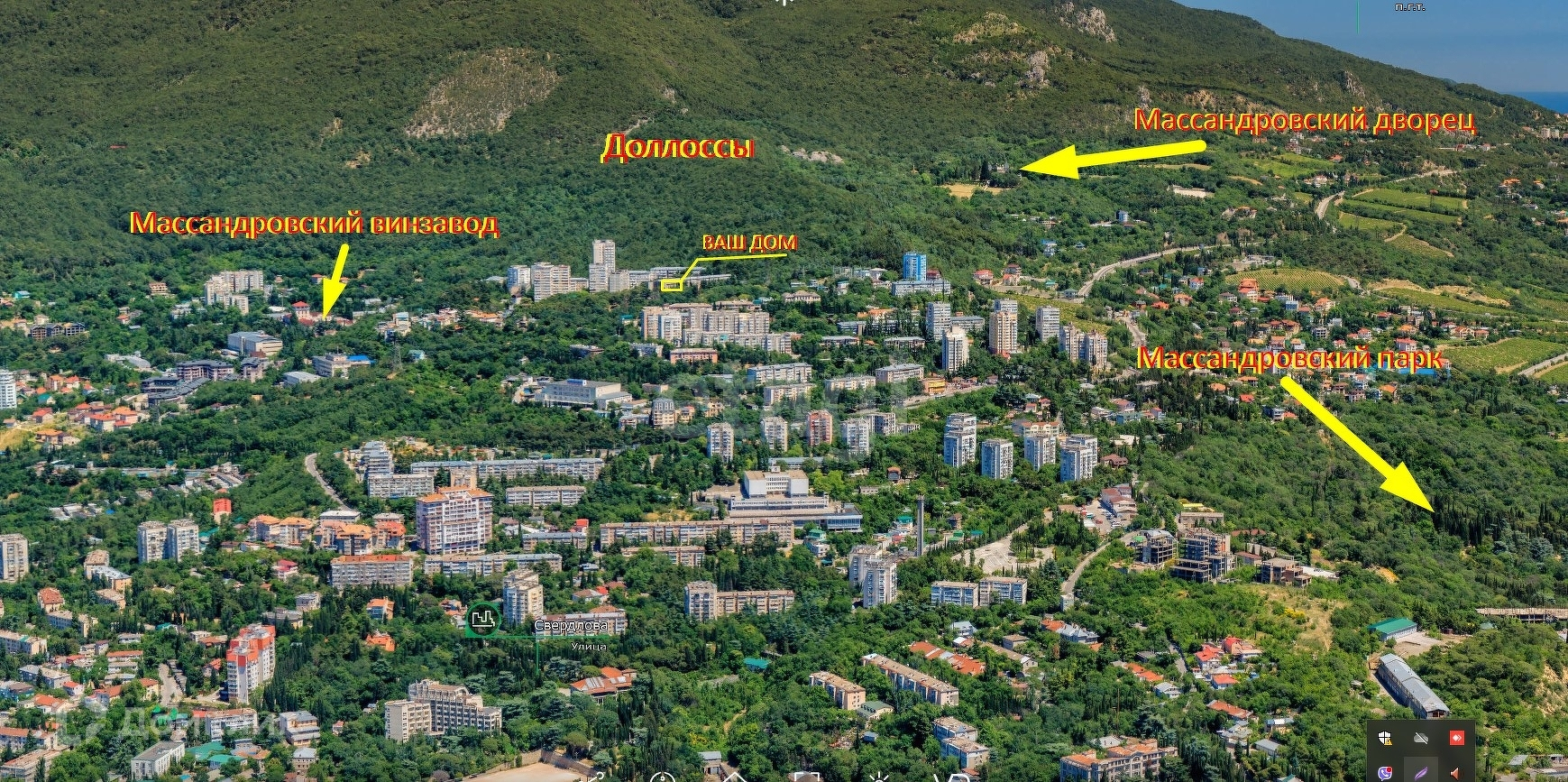 Дом расположен в районе с развитой инфраструктурой: в пешей доступности остановки общественного транспорта, несколько супермаркетов и магазинов, небольшой рыночек, почтовое отделение, амбулатория, детский садик, современный сквер для семейного отдыха, горно-лесной заповедник с чистейшим хвойным воздухом, через который прогулочным шагом дойти до одного из самых красивых дворцов Южнобережья-Массандровского около 10 минут.