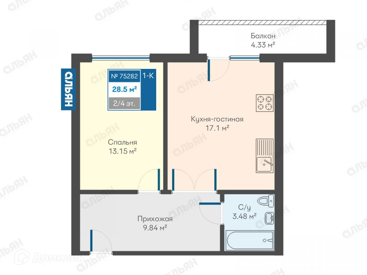 Находится на 2 этаже 4-этажного дома. Общая площадь 28,5 м2.