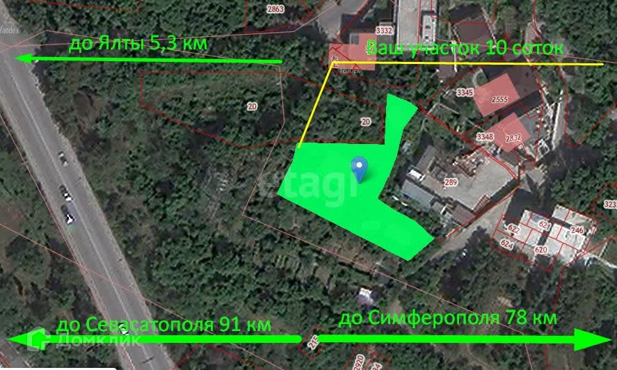 Участок расположен в районе с развитой инфраструктурой. Рядом расположен Массандровский винзавод, остановки общественного транспорта, магазин, выезд на Южнобережное шоссе . До центра города Ялты 5 минут езды.