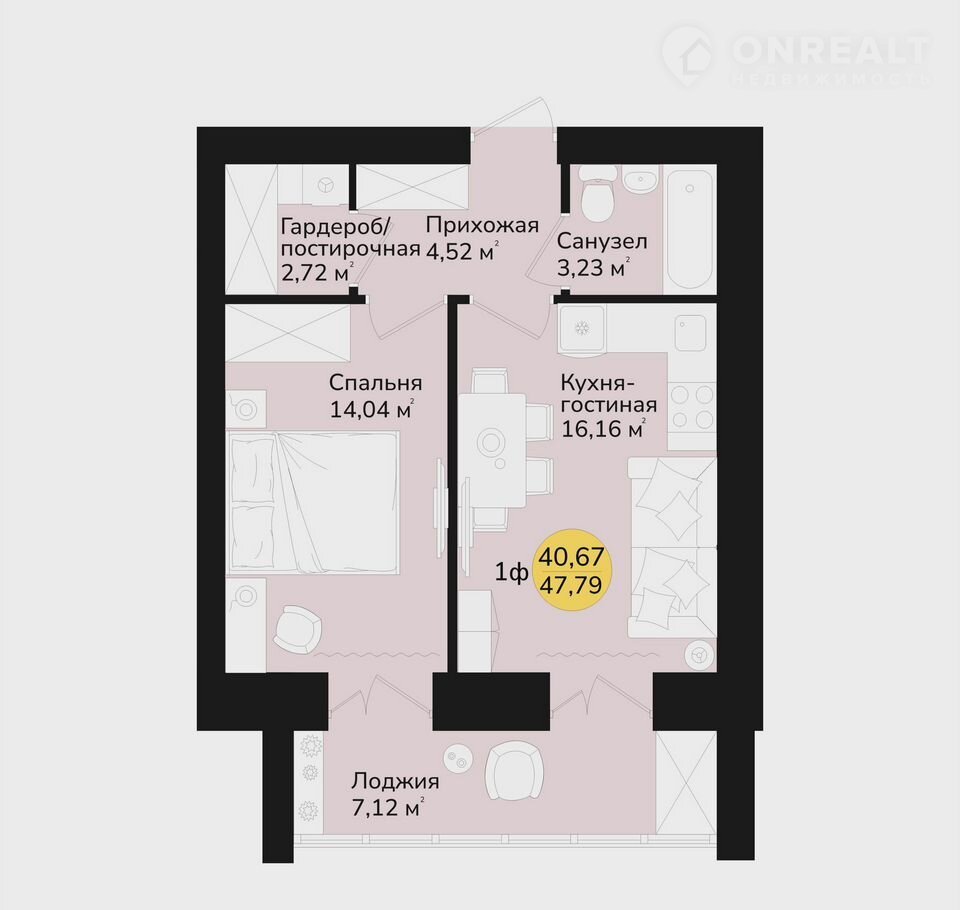1-комнатная квартира, 47.8 м2, этаж 7 / 9, на продажу в посёлке городского типа Медведево