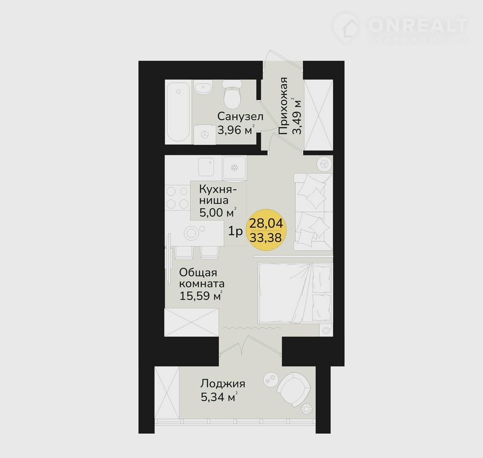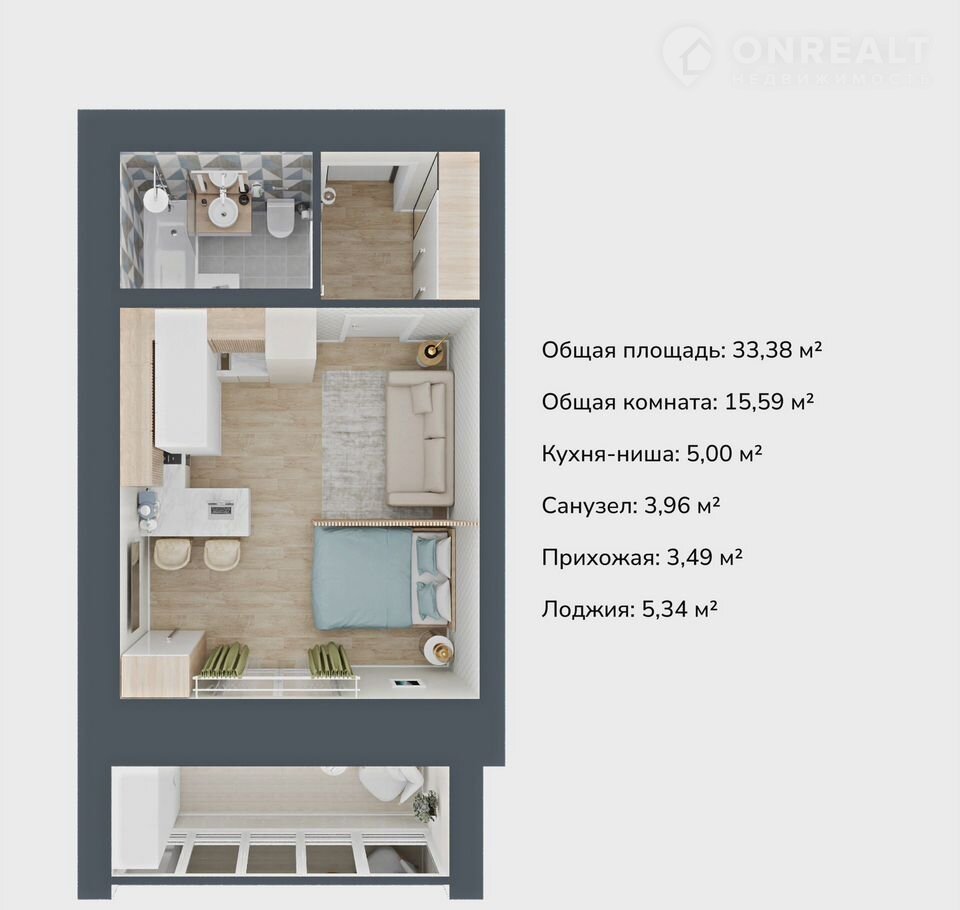 Общая площадь 33.4 м2