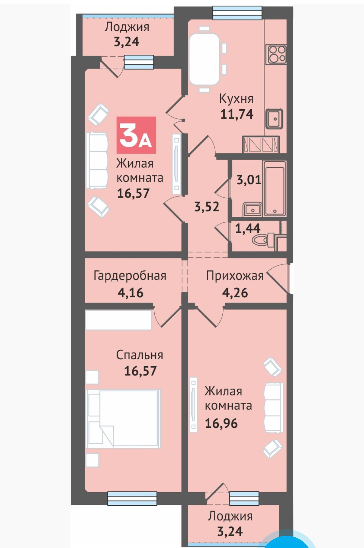 Квартира распашенка. Большая кухня 12 м. Два балкона с панорамным остеклением. Сан.узел раздельный. Есть гардеробная.