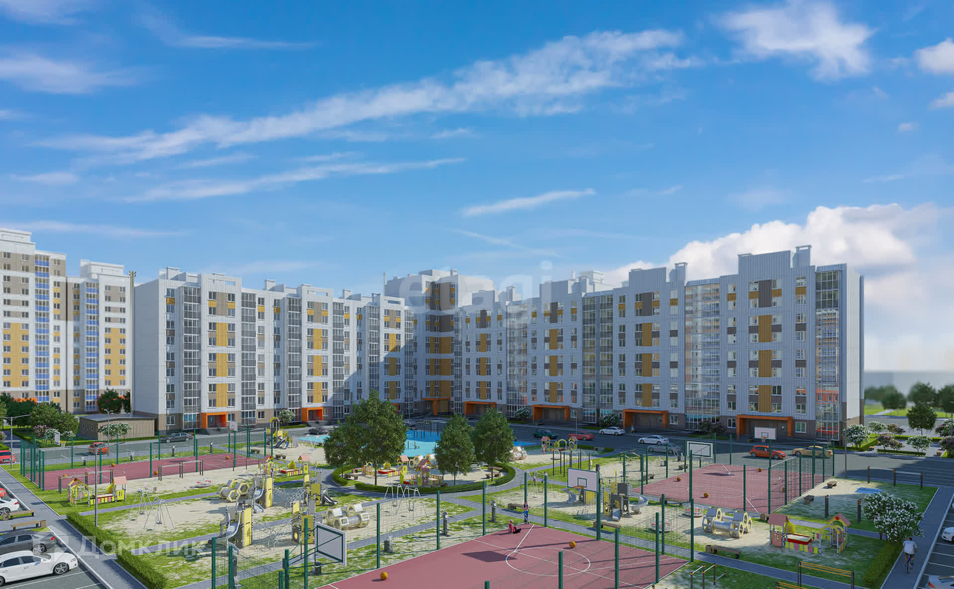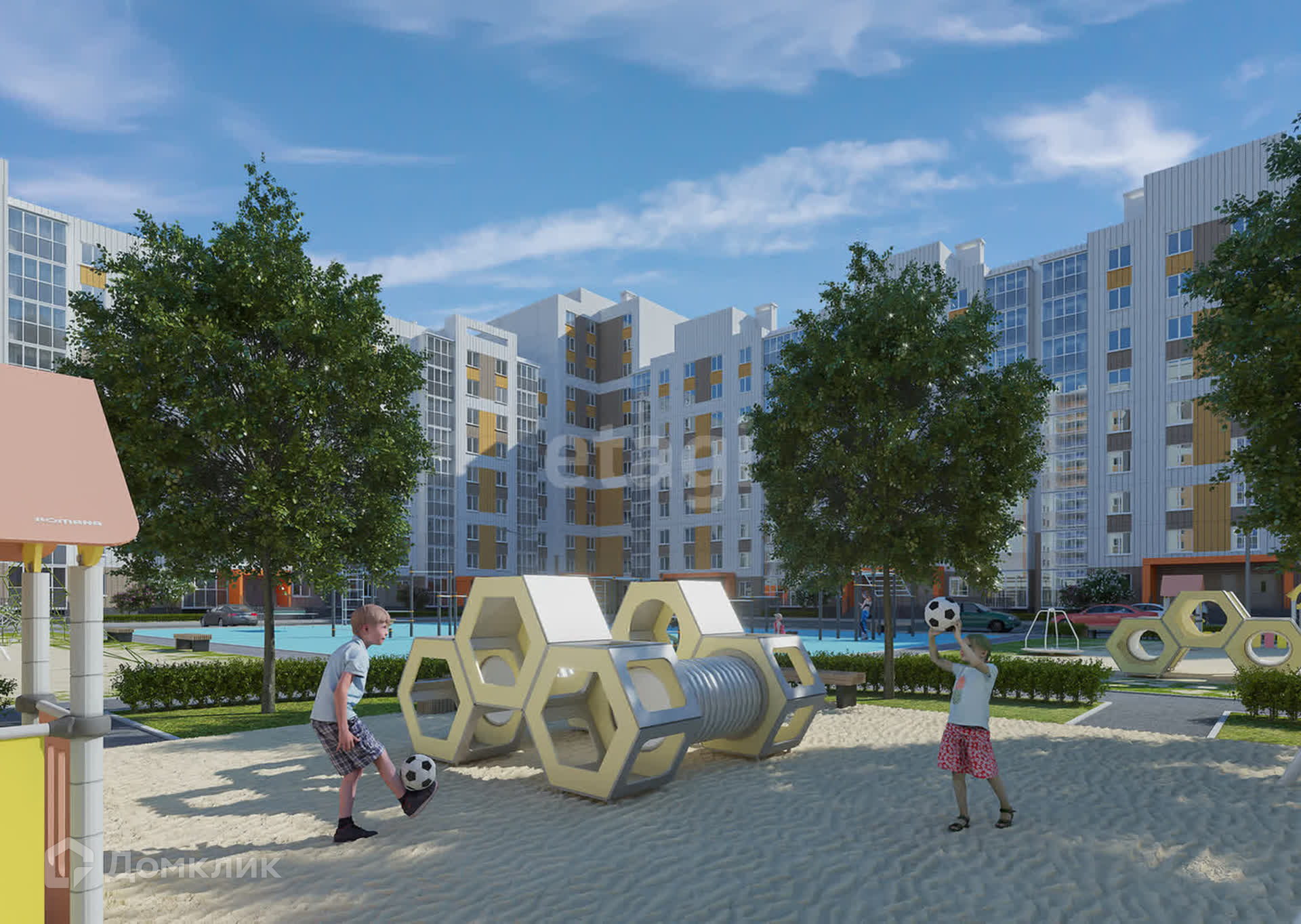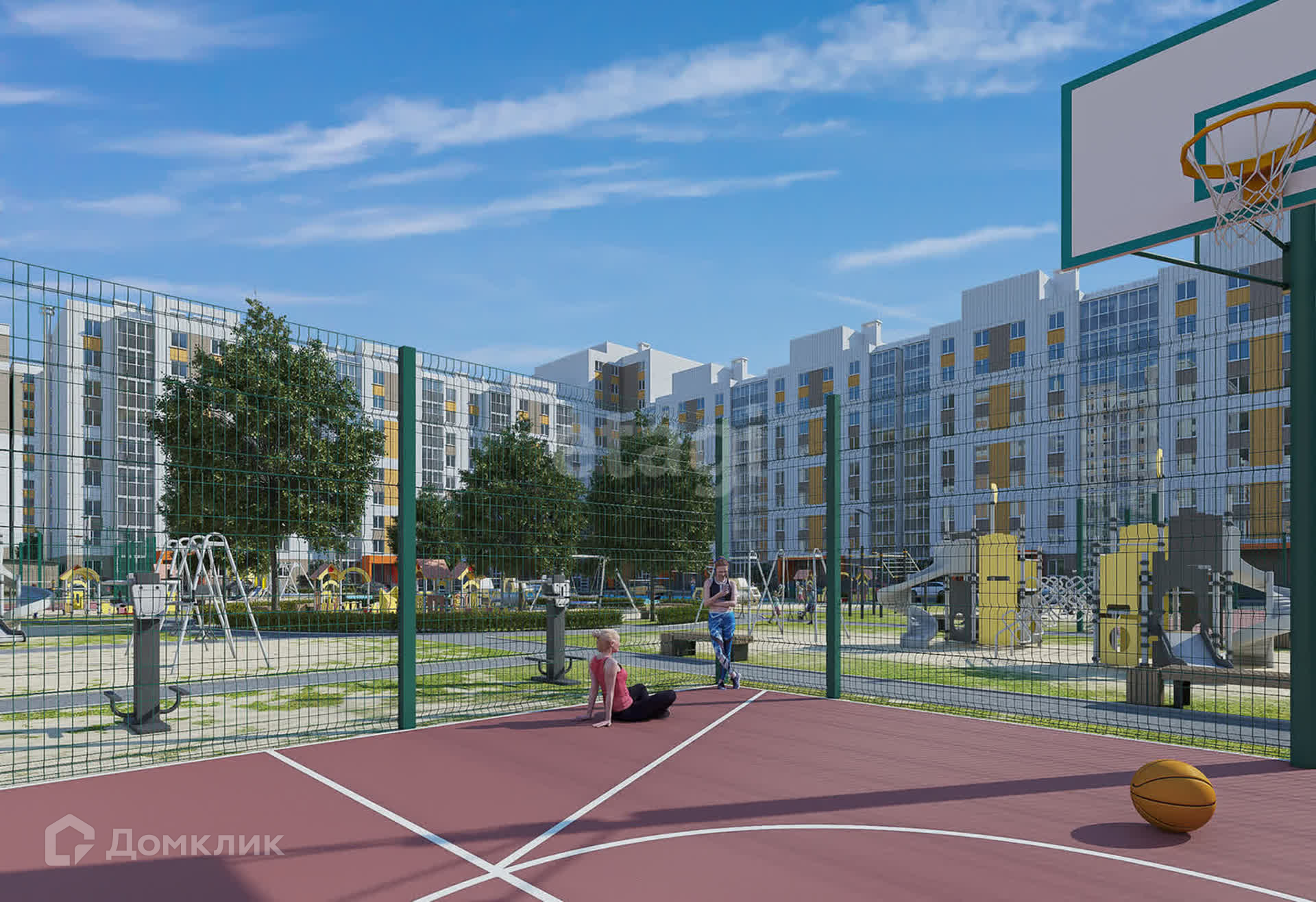 Во дворе большая современная детская и спортивная площадки.