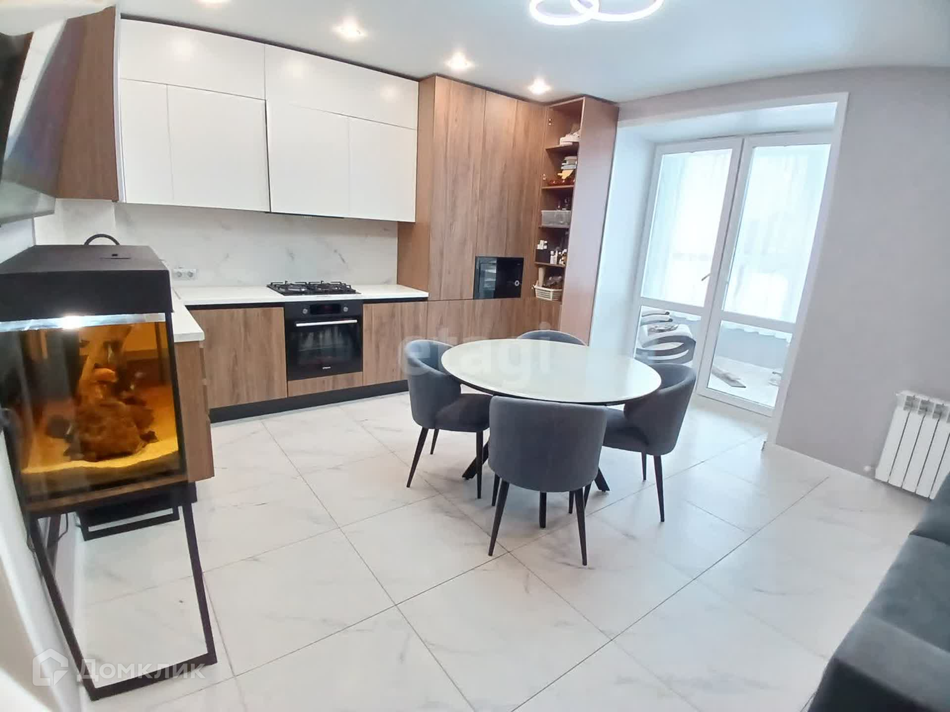 - Из кухни французские окна выходят на утепленную лоджию. На лоджии увеличены оконные рамы, пропускающие много солнечного света.