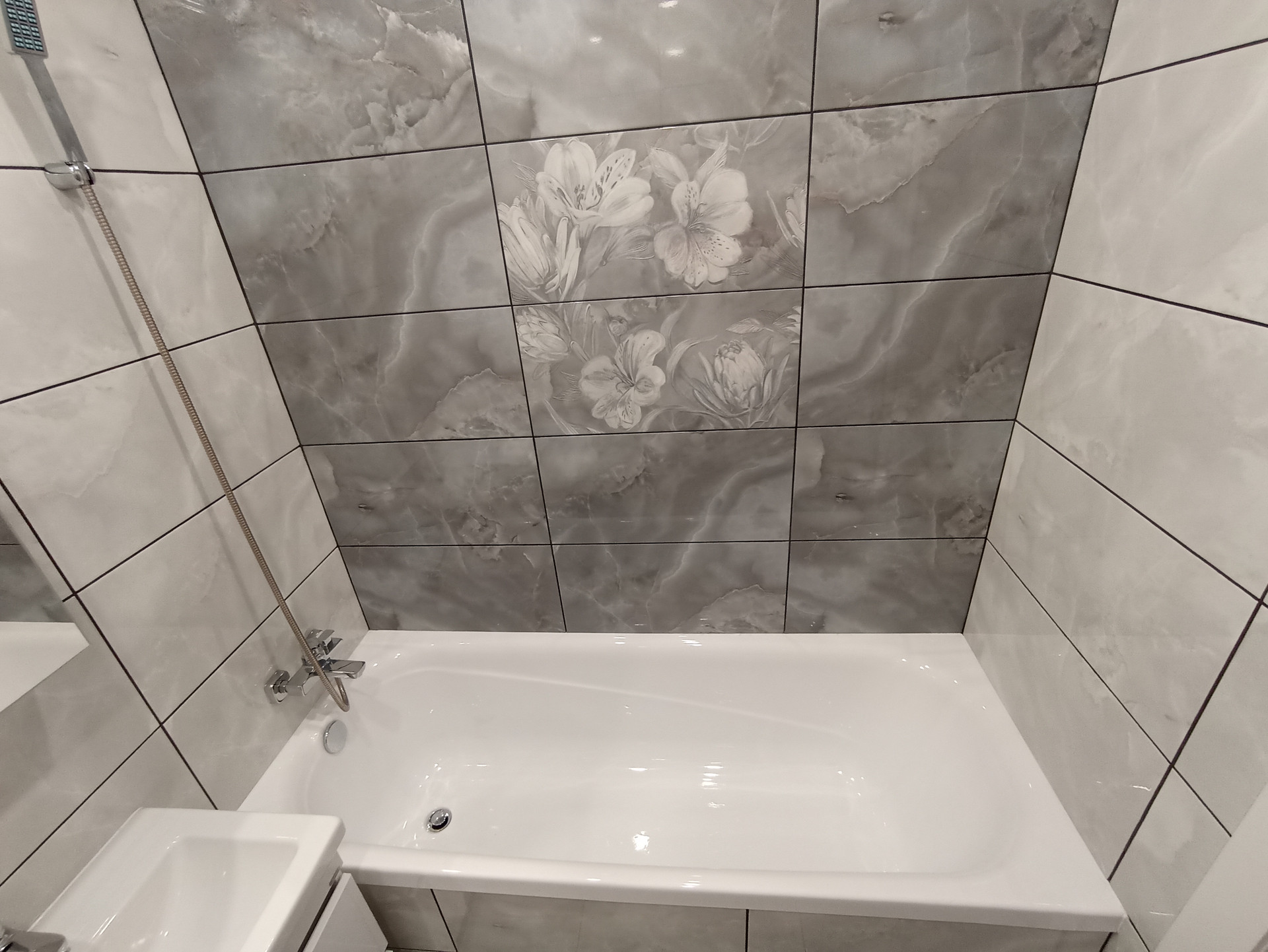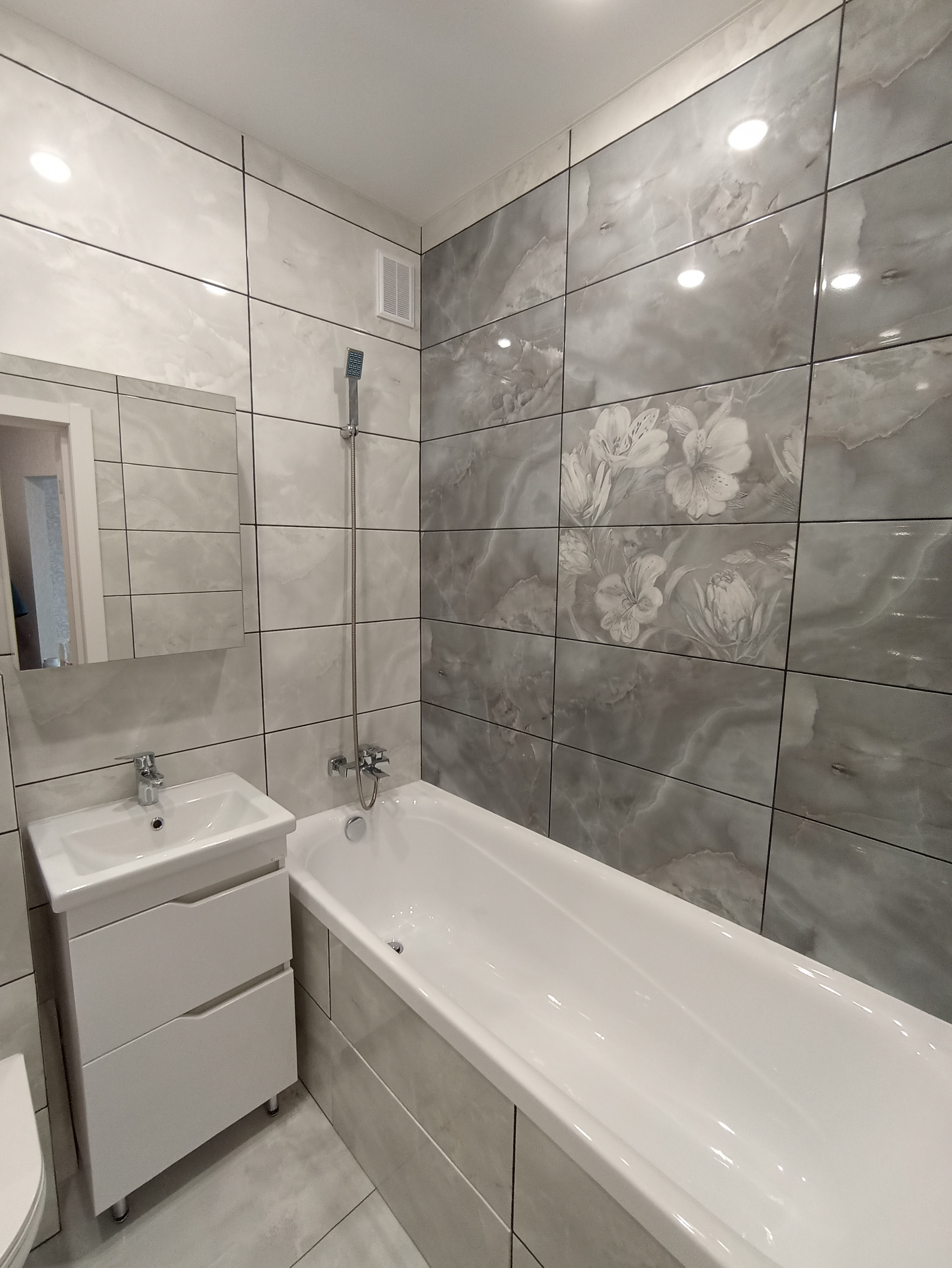 Санузел выполнен в современном кафеле, пол широкоформатный керамогранит. Установлена современная акриловая ванна 180см длинной, инсталляция с гигиеническим душем. Место под стиральную машину подготовлено на кухне, за счет этого ванная комната очень просторная.