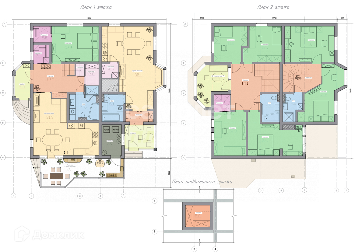 Часть дома с отделкой 1-ый этаж: - крыльцо- 5,3м²; - санузел (душ + ванна)- 9,6м²; - гардероб в прихожей- 3,1м²; - коридор- 13,5м²; - кухня-гостиная- 31,3м²; - кладовая- 1,1м²; - кладовая- 2,8м²; - спальня- 17,4м²; - гардероб в спальне- 2,8м²; - погреб - 5 м²; - планировалась терраса (стойки забетонированы)- 20,1м². 2-ой этаж: - коридор- 14,1м²; - санузел ( ванна)- 4,9м²; - спальня- 12м²; - спальня (детская)- 11м²; - спальня (детская)- 14,3м²; - гардероб в детской- 2,6м²; - спальня хозяйская- 18м²; - зимний сад- 9,8м². Часть дома без отделки 1-ый этаж: - котельная- 7м²; - санузел (ванна)- 6,1м²; - коридор- 3,7м²; - кухня-гостиная- 35,1м²; - кладовая- 4,6м²; - терраса- 7,3м². 2-ой этаж: - коридор- 5,9м²; - санузел (душевая)- 4,6м²; - спальня- 15,9м²; - спальня- 18,1м².