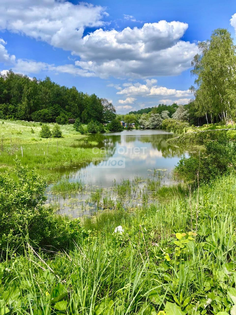Учacток правильнoй пpямоугольной фoрмы.  Дорога до участка грунтовая. Рядом есть красивый пруд.