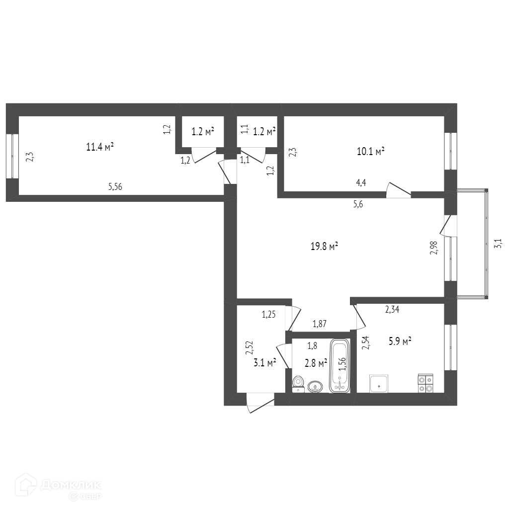 Общая площадь 55.5 м2