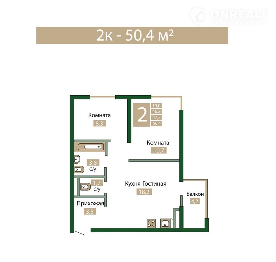 Общая площадь 50.4 м2