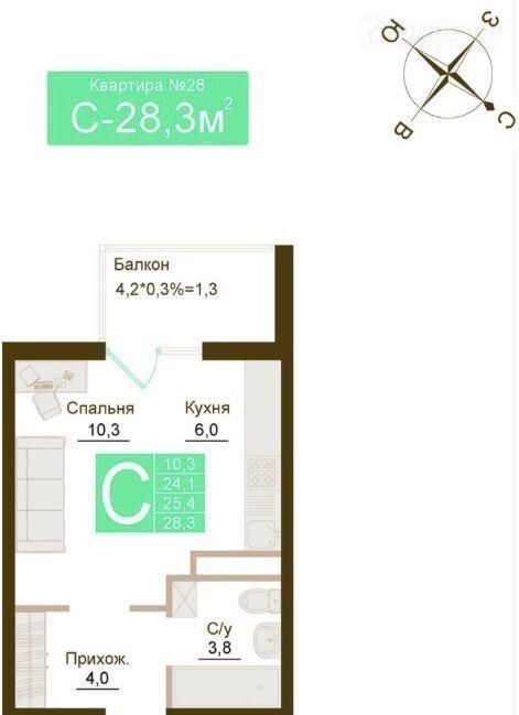 Общая площадь 28.3 м2