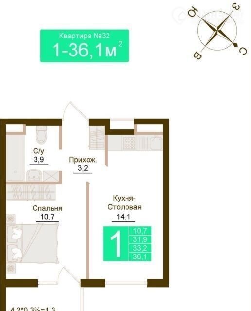 Общая площадь 36.1 м2