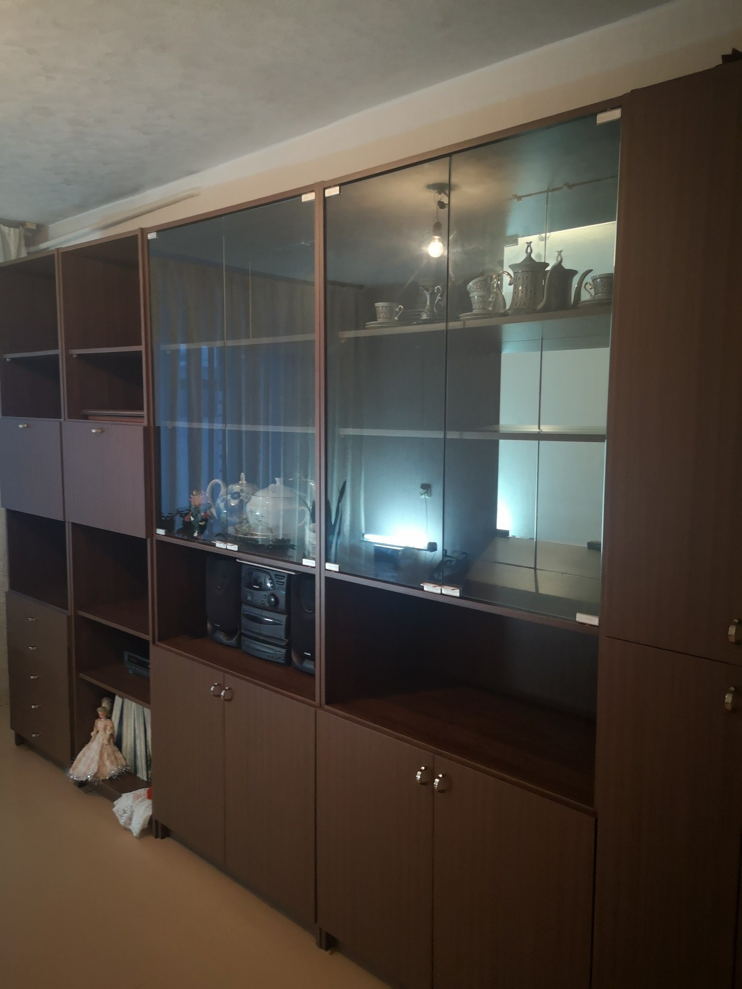 В квартире остаётся мебель: встроенный шкаф-купе, спальный гарнитур, встроенный кухонный гарнитур и обеденный стол, стенка хорошего качества, журнальный столик и тумба. Техника: новая стиральная машина, холодильник, духовка и варочная панель в хорошем состоянии.
