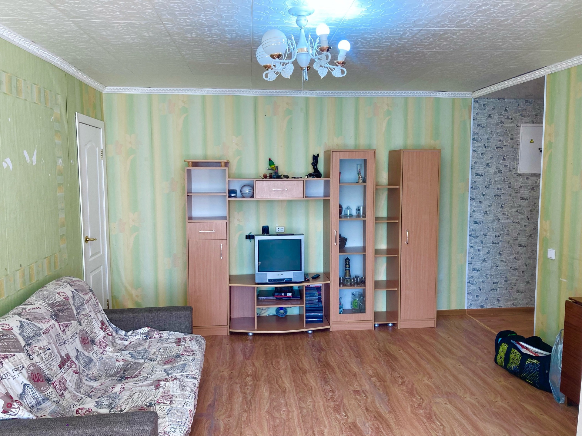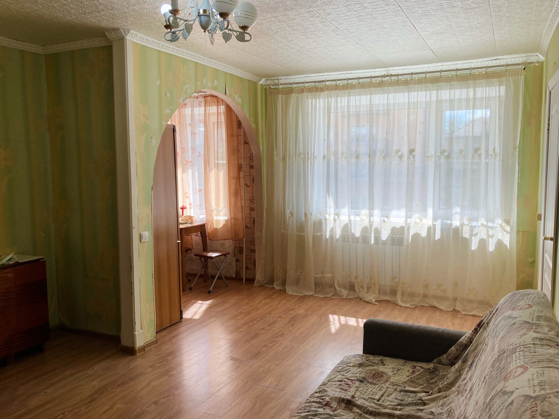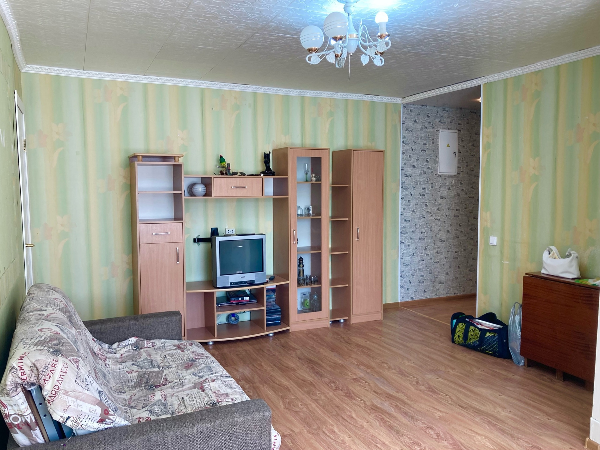 Остается мебель: кухонный гарнитур, стол, диван, кровать и техника: электроплита, бойлер, стиральная машинка;
