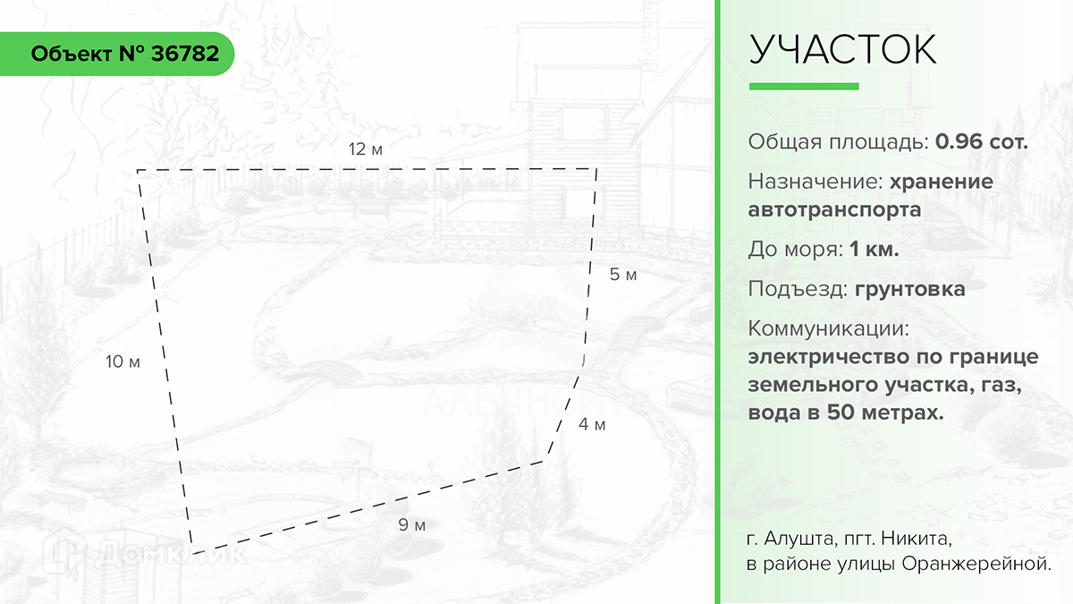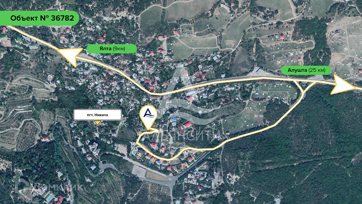 Отличная локация: участок расположен в 800 метрах от трассы, вблизи лесных массивов. Посёлок Никита расположено по юго-западному побережье Крыма, на берегу Чёрного моря, село с развитой инфраструктурой — аптека, магазины, кафе, детская площадка, стадион, школа, почта, церковь, продуктовый рынок. Расстояние до Ялты около 7 километров. Транспортное сообщение осуществляется по автодороге Алушта — Ялта. Автодорога представляет собой горный серпантин с живописными видами на горы и Черное море.