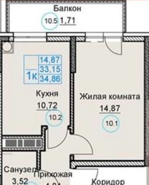 Ваша однокомнатная квартира общей площадью 34,86 м² расположилась на 3 этаже восьмиэтажного дома. В распоряжении жилая комната 14,87 м² и кухня 10,72 м², с которых есть выходы на балкон. Вид с балкона квартиры – во двор
