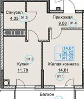 Общая площадь 39.5 м2