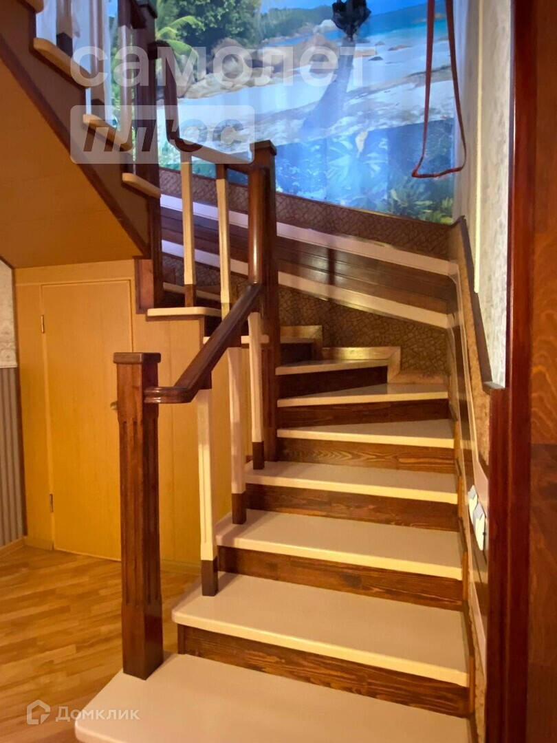 На второй этаж ведет добротная лестница из цельного дерева, там находится просторный холл с окном, три спальных комнаты