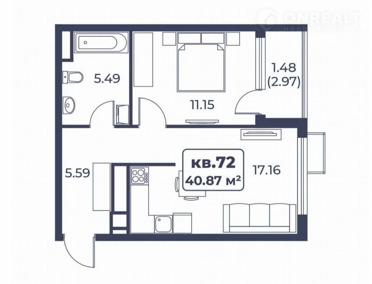 Общая площадь 40.9 м2