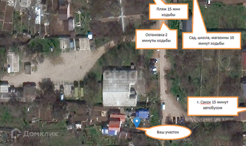 До пляжа и набережной 15 минут ходьбы, до города Саки 15 минут автобусом (транспорт ходит регулярно), остановка автобуса в 5 минутах ходьбы от участка, вся инфраструктура в шаговой доступности.