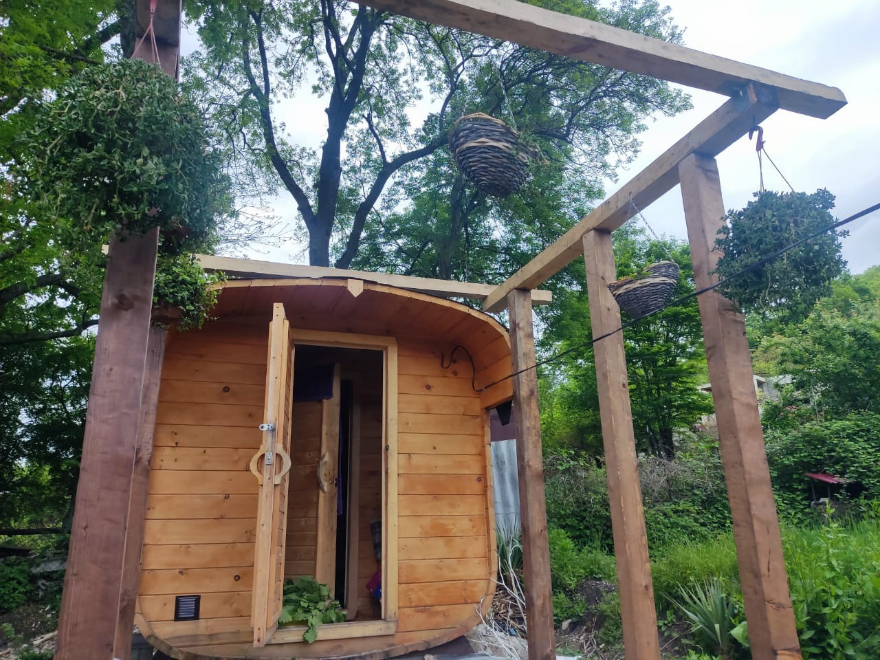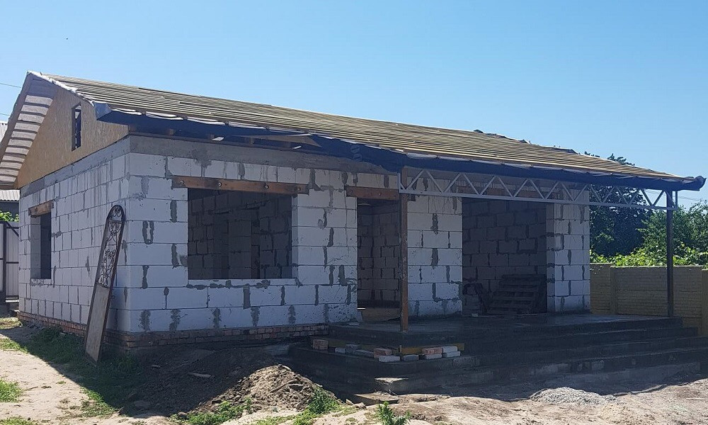 Дом построен из газобетонных блоков, две спальни, кухня гостиная. Баня бочка.